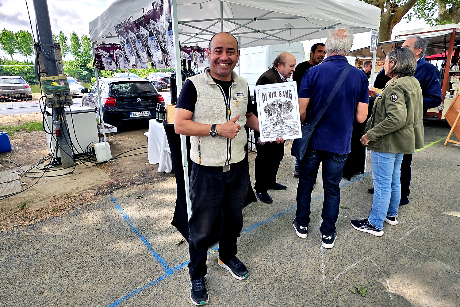 Son travail avait également été présenté à La Réole, lors de Vindediou 2026, où Bordeaux Gazette avait rencontré l’artiste autour de son univers graphique lié au vin. Dans ce rendez-vous mêlant vignerons, concerts, gastronomie locale et animations sur les quais, sa présence trouvait naturellement sa place parmi les propositions cherchant à raconter le vin autrement.