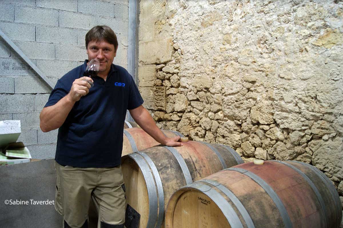 Aux neuf cuves bétons d’une capacité comprise entre 25 et 250 hectolitres, sept cuves inox sont venues s’ajouter. Auparavant à l’extérieur, ces nouveaux contenants de 102 à 154 hectolitres sont maintenant abrités suite à l’expansion du chai il y a deux ans. C’est ici que, dès sa séparation avec la vigne, le précieux raisin se transforme. « Après la rentrée des vendanges, on vinifie. Une première fermentation alcoolique qui transforme le vin en alcool se fait dans les cuves en inox ce qui permet de maîtriser la température. Puis, la deuxième fermentation et l’élevage du vin s’établie en cuve ciment entre 20 et 22 degrés. Le vin est alors remis en aérien pendant l’hiver pour enlever les impuretés qui se déposent naturellement par le froid. » détaille-t-il. Dans les barriques, c’est la cuvée spéciale « fût de chêne » qui murit. Paul choisit un vin de coteau sur Belvès-de-Castillon, assez charnu, pour supporter le goût du bois. Elle y passera entre 10 et 18 mois. L’année suivante, la cuvée lyrique y séjournera après une première fermentation en cuve inox pour apporter finesse et fondue du boisé.