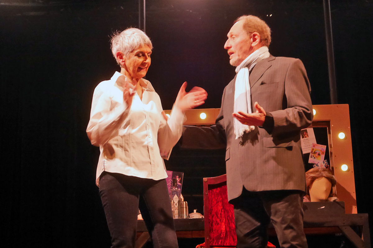 Jean-Pierre TERRACOL assisté de Josette DISCAZEAUX en est le metteur en scène. Ils se sont donnés à fond avec cette belle mise en scène aux va-et-vient incessants des acteurs. L’action se situe dans la loge de la comédienne qui figure la frontière entre deux mondes ; d’un côté la scène et ses lumières aveuglantes et de l’autre l’impitoyable lucidité de la vie réelle. L’actrice oscille entre les deux. Les passages entre ces deux univers sont ponctués par une étrange musique, sorte de joli leitmotiv léger de boite à musique de plus en plus inquiétant au fur et à mesure de l’avancement de l’histoire.