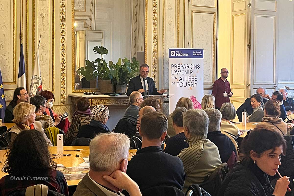 C’est donc mercredi à 18h que la première concertation des allées de Tourny se tenait. Environ 250 personnes était attendu dans les salons de la mairie. Il y avait tous sexes, différents âges et surtout pas seulement des usagers des allées de Tourny. Après un vote à main levé afin de répondre à plusieurs questions, cela a confirmé que le chantier des allées de Tourny ne concernait pas seulement les habitants de celles-ci, mais bien les Bordelais dans la globalité et même les métropolitains. Les riverains bordelais étaient venus en masse dans les salons de la mairie qui était prêts pour l’occasion. Plusieurs tables étaient attribuées et celles-ci définissaient un atelier. Les personnes de chaque table devaient se concerter et réaliser un travail de groupe. L’exercice est plutôt simple. Un grand plan des allées et des gommettes vertes et rouges. Vertes pour désigner les endroits positifs et l’inverse pour les rouges. Les riverains étaient invités à noter les changements qu’ils désiraient.