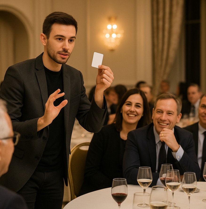 Pour marquer les esprits dès les premières minutes, l’intervention d’un magicien mentaliste professionnel figure parmi les animations les plus percutantes. À Bordeaux, Théotim s’impose comme une référence grâce à des performances mêlant psychologie, illusions et interaction avec le public.