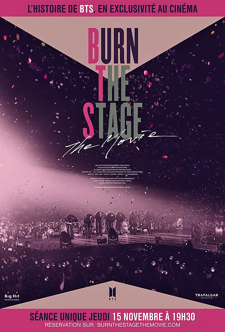 Synopsis : Burn the Stage : the Movie est le premier documentaire de BTS. Filmé dans les coulisses de la tournée BTS WINGS TOUR, il suit l’ascension fulgurante du groupe. Cet événement au cinéma permet, avec un regard intime, de voir comment le groupe le plus populaire au monde fait tomber les barrières et envahit la scène musicale mondiale. Des séquences de concert exclusives et de toutes nouvelles interviews de chaque membre de BTS offrent aux fans un aperçu sans précédent de leur vie et l’occasion pour tous de se retrouver dans les salles de cinéma du monde entier.