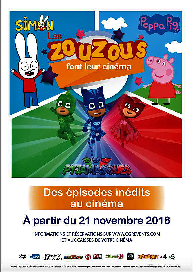Synopsis : Rendez-vous incontournable des enfants, Les Zouzous envahissent les salles obscures durant la période de Noël avec un programme exceptionnel : 6 épisodes 100% inédits de Pyjamasques, Peppa Pig et Simon. Pendant 45 minutes, les enfants découvriront les toutes nouvelles aventures de leurshéros préférés dans le cadre d’une séance de cinéma en avant-première exclusive. Le programme est adapté aux tout-petits en termes de durée et de contenu éditorial. Un moment ludique et joyeux à vivre en famille, pour faire découvrir aux enfants la magie du cinéma !