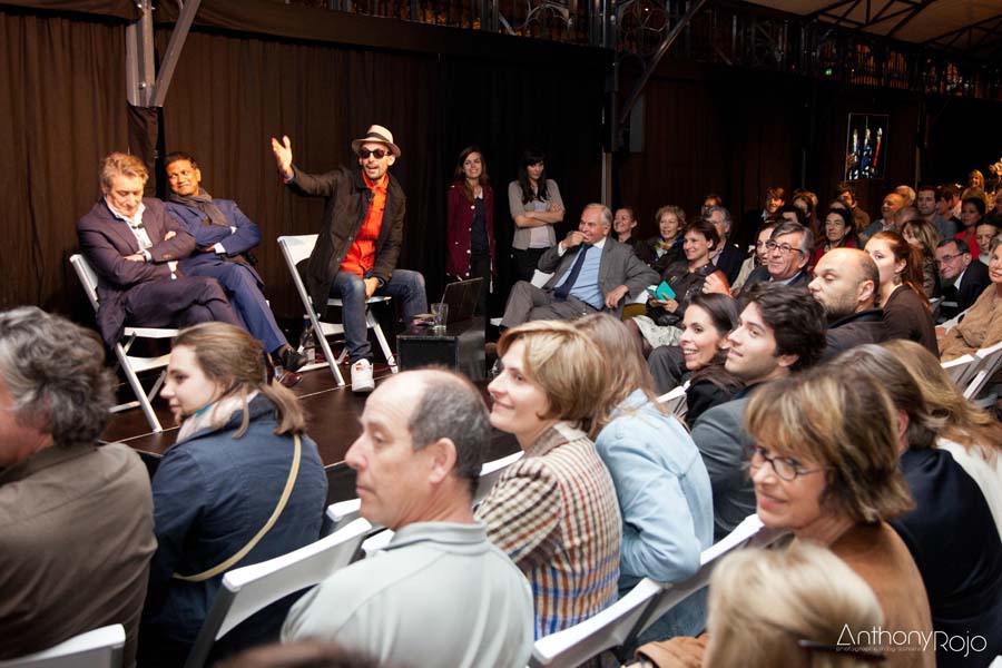 C’est dans le nouveau Pavillon La Boétie, une magnifique orangerie de verre spécialement installée derrière le Château que près de 400 personnes ont pu assister à cette première Nuit du Savoir, en ce 13 Juin 2013, de 21h à minuit. Soirée animée par l’artiste JR, qui comme le souhaitait André Gide en son temps, semblait être venu pour nous enseigner la ferveur. Difficile de définir le personnage de JR, ainsi que sa démarche. Plein de charme, résolu, le personnage est spontané et très vite attachant. Il sait parfaitement de quoi il parle, et très rapidement son discours captive le public. Exposer librement dans les rues, capter l’attention des gens qui ne sont habituellement pas ceux que l’on trouve dans les musées, tout en restant anonyme, tel est l’un des aspects essentiels de sa démarche. A l’inverse du génie artistique d’un seul, JR nous parlera de travail et de création collective, de la patience et du temps nécessaire à la création, de cet art qui s’affiche sans avoir été invité laissant un espace de rencontre, de méditation, à tous les passants, dès lors que la rue devient la scène et les spectateurs les acteurs.