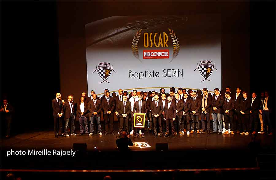 C’est dans un théâtre du Casino Barrière plein a craqué que cette sympathique cérémonie a eu lieu et s’il y a déjà eu quelques remises d’Oscar Midi Olympique à des joueurs de l’UBB (Jaulhac, Clarkin, Adams, Connor) c’est la première fois qu’un titulaire du XV de France, issu des rangs de l’UBB et pur produit de la formation aquitaine est distingué. Bien sur le maitre de cérémonie est toujours Jean Abeilhou avec son compère Romain Magellan qui assure l’interview du nominé et qui le soumet à un certain nombre de petits jeux qui amusent toujours les présents ave cette année des ballons envoyés au pied ou à la main dans la salle et même le balcon a été arrosé. Il va sans dire que les ballons étaient tous dédicacés par l’Oscar Midi Olympique du jour. On a eu droit a un fort sympathique "teaser" ou on a découvert " le petit garçon aux boucles blondes" au sortir du berceau et durant son enfance et son adolescence. Pour représenter la mairie de Bègles et celle de Bordeaux ce sont Franck Joandet pour la première et Guy Accocebery pour la seconde qui ont pris la parole, Guy Accocebery qui a précédé Baptiste Serin à la mêlée du XV de France ( 19 sélection entre 1994 et 1997) a précisé que non seulement ii faut avoir des qualités morales et techniques pour tenir le poste mais qu’il faut aussi un "regard coquin" pour être à la hauteur. Il considère que l’actuel titulaire le possède, bien sûr tout cela en lien avec la fabuleuse passe chistera à Louis Picamoles contre la Nouvelle Zelande qui reste le geste de Baptiste qui est dans toutes les mémoires et qui surement restera lié a son histoire.