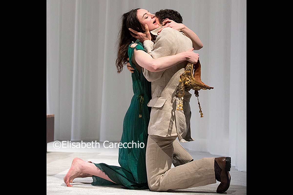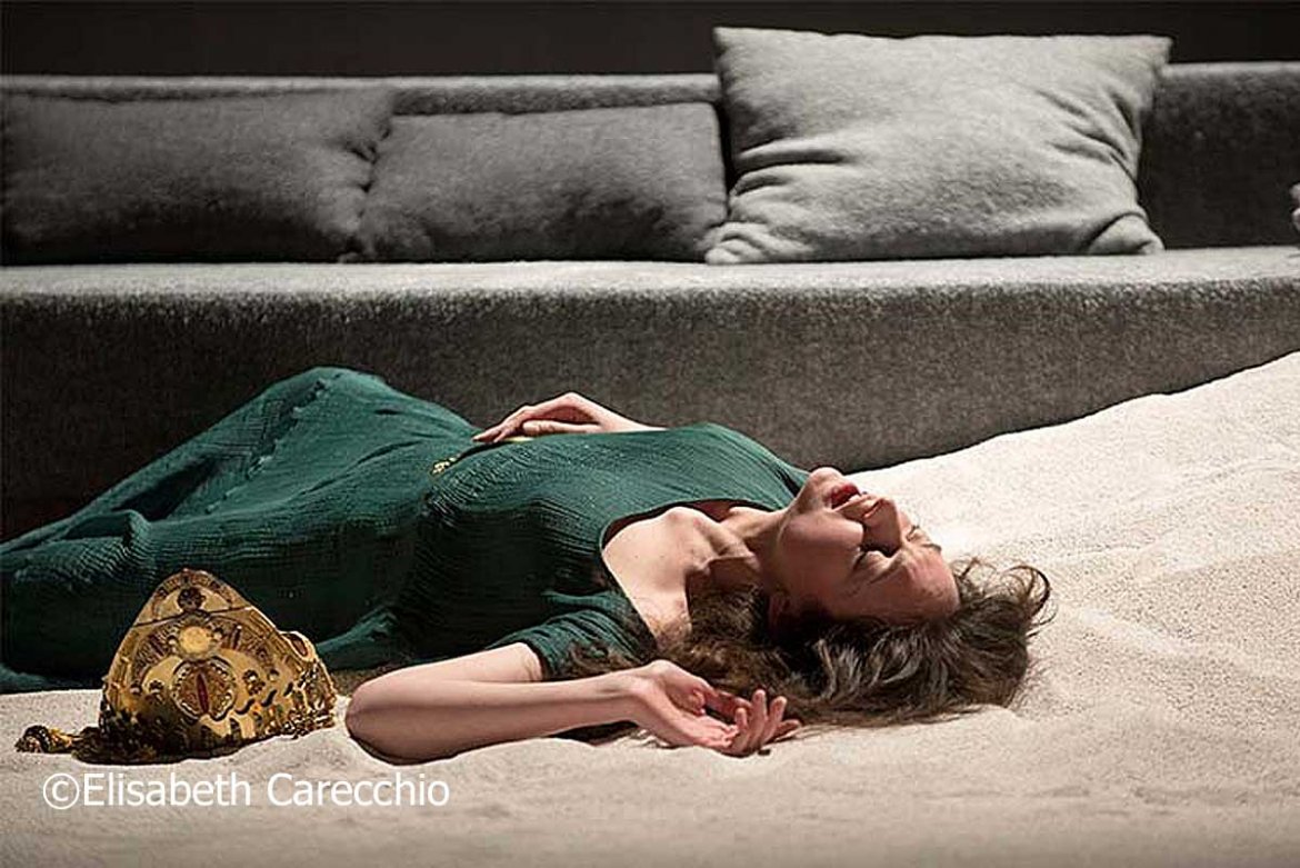 Célie Pauthe la metteure en scène (Directrice du CDN de Besançon ) a été inspirée par Marguerite Duras qui, en 1979 avait réalisé un court métrage, « Césarée », illustrant le retour de Bérénice, répudiée par Titus, dans sa ville de Judée. Les extraits de ce film et la voix de Duras les commentant sont diffusés entre les actes et proposent quelques respirations à la tragédie de Racine. Le plateau, nu comme un désert d’Orient simplement recouvert de sable blanc en couche épaisse et monticules, laisse apparaître comme un mirage, le décor épuré de Guillaume Delaveau fait de grands rideaux translucides en colonne de marbre et en ciel pâle où se fondent les personnages … Et puis dans ce désert, un appartement sobrement souligné par un gris canapé d’angle, quelques coussins, une couverture rose et à jardin une table basse … Il faut imaginer … ! Les costumes dans les gris et les beige hormis la « stola » longue et verte de notre reine nous ramènent aux réalités d’aujourd’hui avec les longs manteaux, jeans, tee-shirts et chaussures de montagne. Mais cette intemporalité durant les deux heures trente, sans lassitude, de cette tragédie, rejoint le mystique et le moderne face aux rythmes des alexandrins de l’auteur. La brutalité des hommes et des guerres aujourd’hui, de l’exil, de la recherche identitaire dessinent une surprenante résonance à cette tragédie de l’appartenance aux sols. Comme la mise en scène parfaitement géométrique et sans effets superflus … C’est simplement beau !