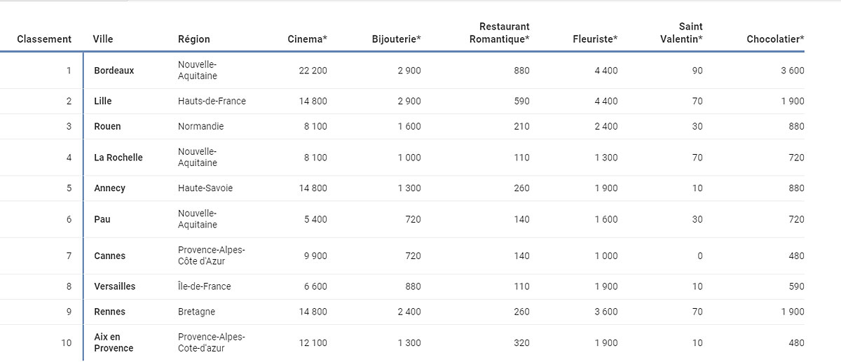 Ont été considérées et analysées pour ce classement, toutes les villes françaises de plus de 70 000 habitants. Nous avons étudié les volumes de recherche sur Google avec des mots-clés liés à la Saint-Valentin. Pour ce faire, nous avons recueilli le volume de recherche par habitant des mots-clés suivants : "cinéma", "bijouterie", "restaurant romantique", "fleuriste", "st valentin", "chocolatier" + le nom de la ville. Les villes ont été classées pour chacun de ces mots-clés. Pour obtenir le classement final des meilleures villes pour les romantiques, un classement moyen a été effectué en donnant un poids plus important aux mots-clés "st valentin + ville" et "restaurant romantique + ville".