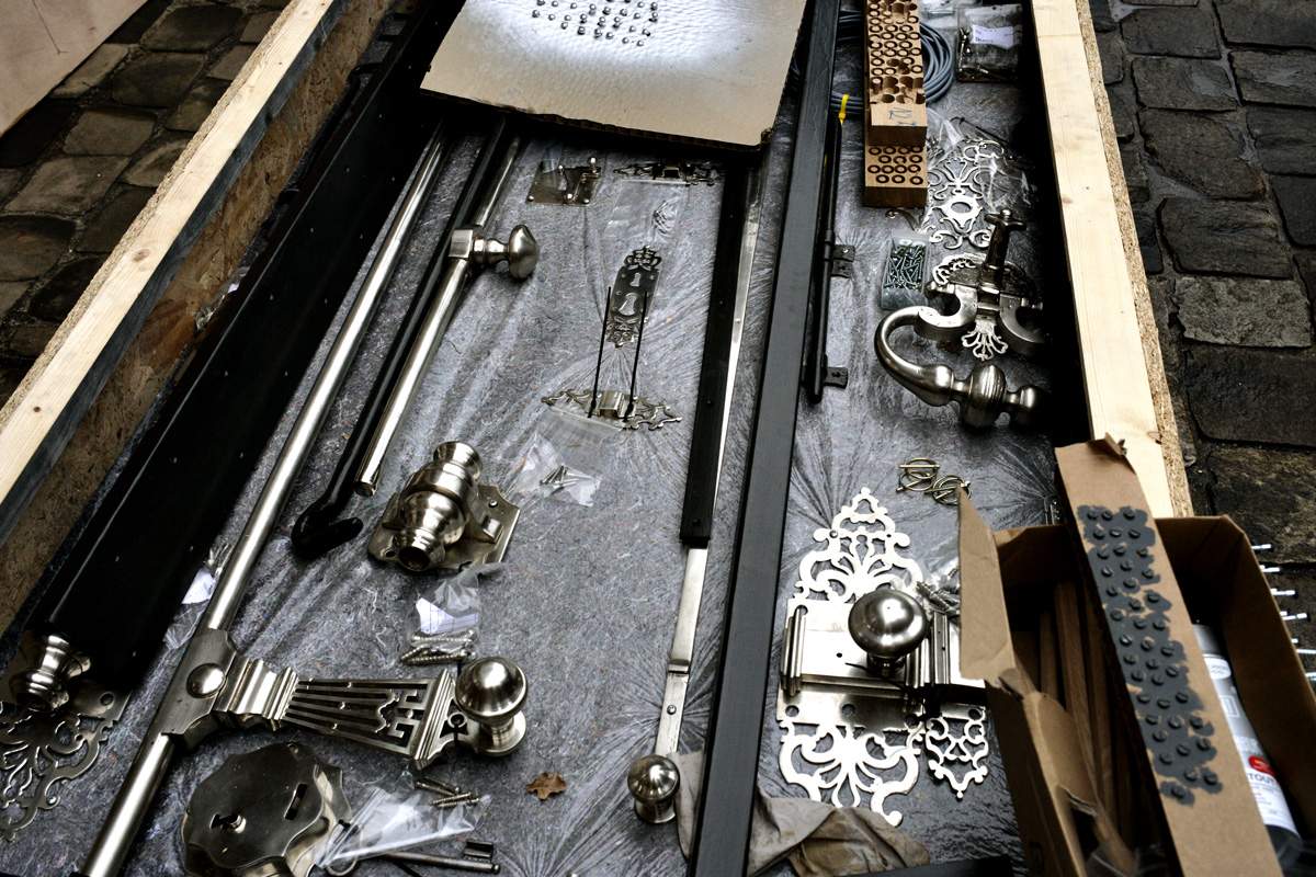 La pose de la nouvelle porte a été un défi : les artisans ont dû composer avec un dévers de 12 cm dans l’alignement ancien du porche et un léger déséquilibre entre les cadres latéraux. Plusieurs jours d’ajustements finement calibrés ont été nécessaires.