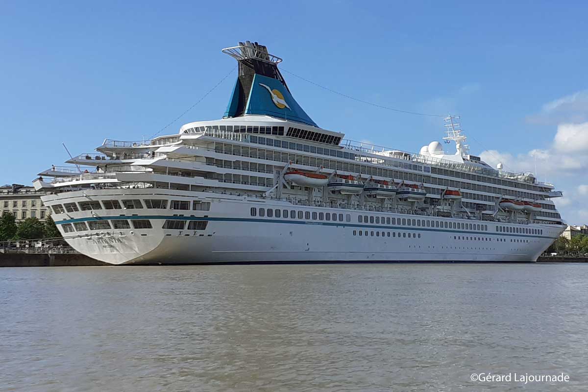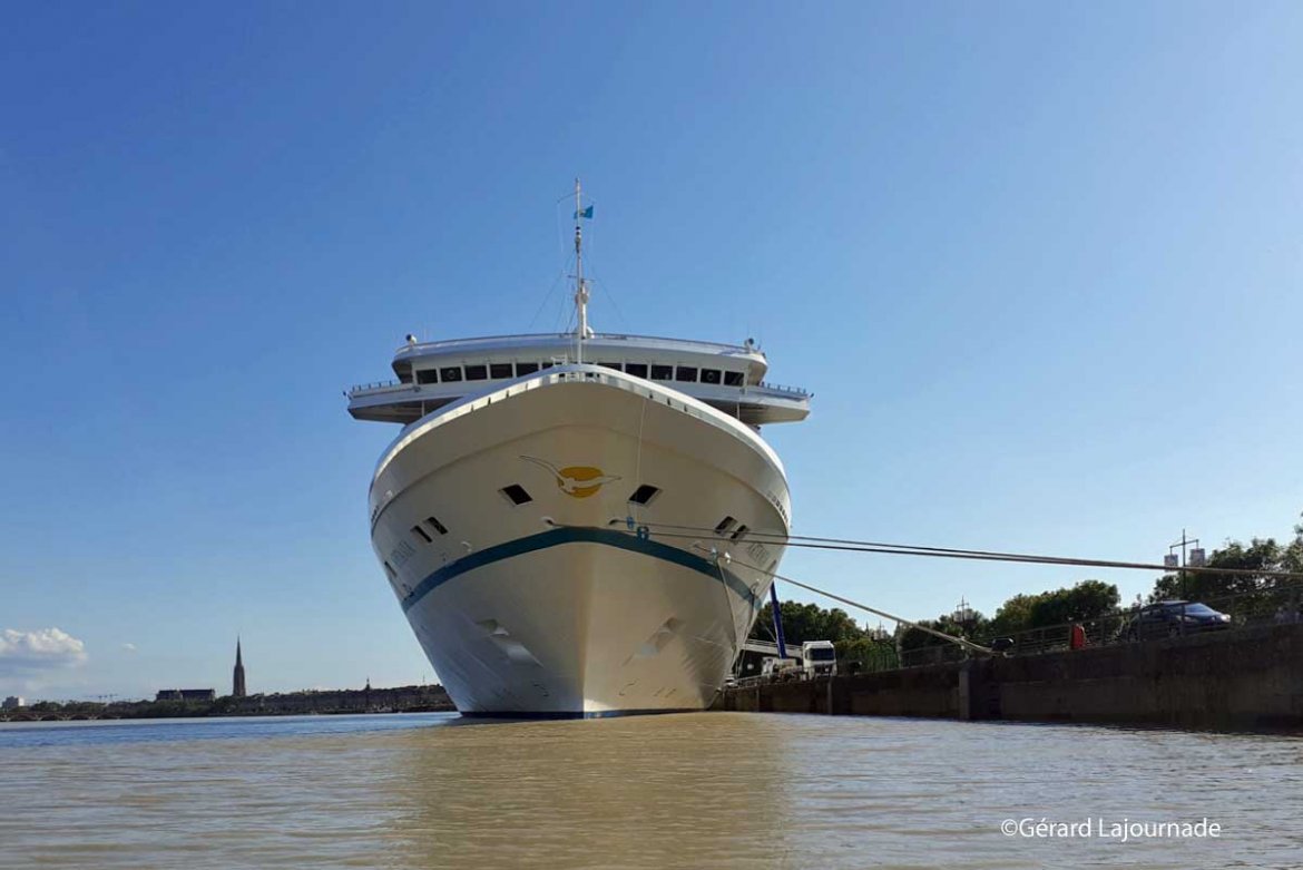 L’Artania est un navire de 230 mètres de long et de 29, 60 mètres de large qui peut accueillir près de 1200 passagers. Il a été inauguré par la Princesse Diana en 1984, construit en Finlande pour la compagnie américaine Princes Cruises, il a porté le nom de Princess Diana. En 2005 il est transféré vers la flotte de P & O Cruises et a par la même occasion changé de nom pour devenir le MS Artemis sous pavillon des Bermudes. Depuis avril 2011, il navigue pour Phoenix Reisen sous le nom d’Artania et cela fait donc 37 ans qu’il arpente les mers. Cette croisière au départ de Brème a conduit ses passagers à Douvres, puis à l’Ile de Portland toujours en Angleterre puis il a traversé le Golfe de Gascogne pour se rendre à La Corogne et il est sur le chemin du retour après escale à Bilbao, une courte matinée au Verdon pour se retrouver à Bordeaux ou il séjourne depuis hier à 18 heures. Il quittera Bordeaux dans l’après midi pour rejoindre Le Havre puis Zeebrugge en Belgique et escale en Hollande à Rotterdam avant retour à la case départ de Brème.