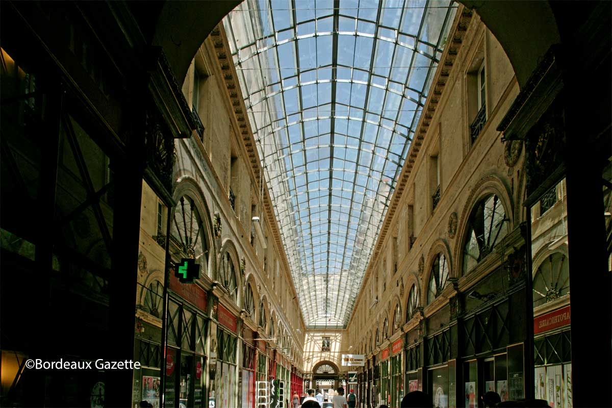 L’harmonie entre le classique et le moderne est également perceptible à travers les passages couverts du centre ville. Ils sont aux nombres de deux aujourd’hui, il s’agit du passage Sarget et de la Galerie Bordelaise. Nous concentrerons sur le deuxième exemple datant de 1834, ceci correspond à la période du développement de ce type de structure. En effet, sa nature d’abri permet aux passants de se restaurer ou de se promener peu importe le temps. L’évolution de l’industrie invite à ce genre de nouveaux chantiers qui accueillent les nouveaux magasins de prêt à porter et autres commerces. Les emplacements choisis sont les quartiers commerçants de la ville en général. L’architecte de la Galerie bordelaise est Gabriel-Joseph Durand, il s’inspire de la galerie Vivienne dans le 2ème arrondissement de Paris, qui est elle d’une plus grande superficie. Néanmoins nous n’avons à rougir de ce passage dont la verrière éclaire avec justesse les passants : lumière zénithal qui laisse des coins de pénombre pour se rafraîchir, le tout marqué par le style Premier Empire avec ses reliefs aux motifs antiques, et sa polychromie aux couleurs impériales (vert, rouge, or). Ce chemin, allant de la rue Sainte-Catherine à la rue des Pilliers-de-Tutelle, prouve encore une fois qu’il est possible d’allier deux architectures différentes sans que l’unes annihile l’autre.