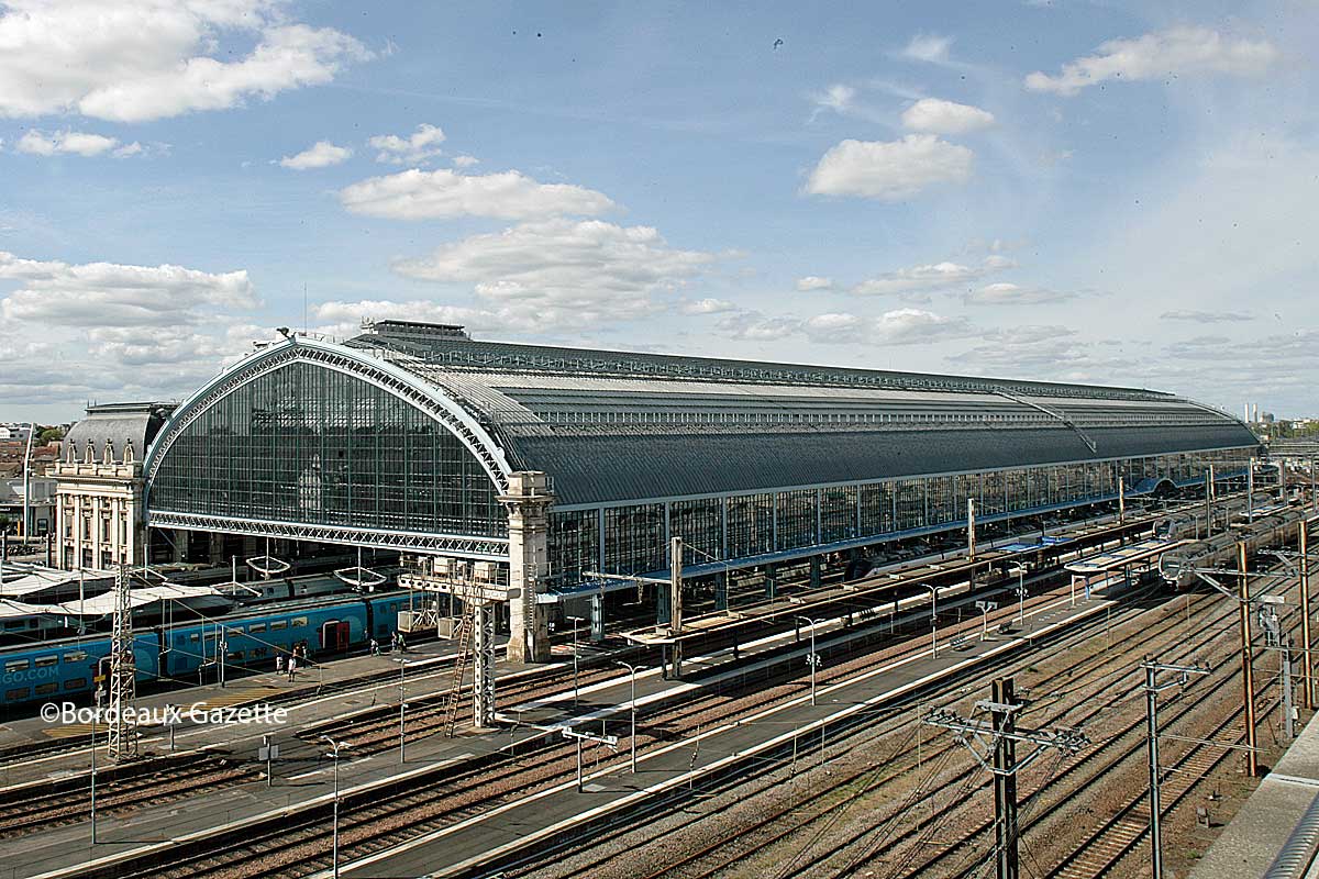 En 1898 est élevé à Bordeaux l’une des plus grandes verrières métalliques d’Europe : 296,96 mètres de long sur 57,70 mètres de largeur, 26 mètres étant sa plus grande hauteur. Il s’agit du plafond des quais de la gare du Midi (ancien nom de la gare St-Jean). Plusieurs gares desservaient la ville : la gare de Bordeaux-Ségur vers Saint-Genès qui allait jusqu’à la Teste, et la gare d’Orléans au niveau de la Bastide qui reliait Bordeaux à Paris. Toutes ont disparu au profit de la gare appartenant à la Compagnie du Midi qui desservirait à présent toutes les lignes. Cette gare au départ provisoire, construite en bois reste de nos jours la gare principale de Bordeaux. Elle témoigne de l’ambition de cette compagnie alors la plus importante du Sud-Ouest, d’avoir une renommée en dehors des frontières françaises. Le classicisme est encore présent sur ses murs, mais pour ses constructeurs elle participe à cette futur gloire. Le classicisme ne s’oppose pas ici à la modernité du fer et du verre, les deux se complètent : « Cette gare doit être une construction qui ait un caractère monumental, tout en gardant une simplicité dans les lignes et surtout dans les détails décoratifs », lettre de l’ingénieur Choron à l’architecte du projet Toudoire, le 25 juillet 1893. Les lignes de fer se mêlent aux lignes de pierre, l’ensemble accentué par les quelques sculptures de Gaston Veuvenot-Leroux et de Charles Beylard.