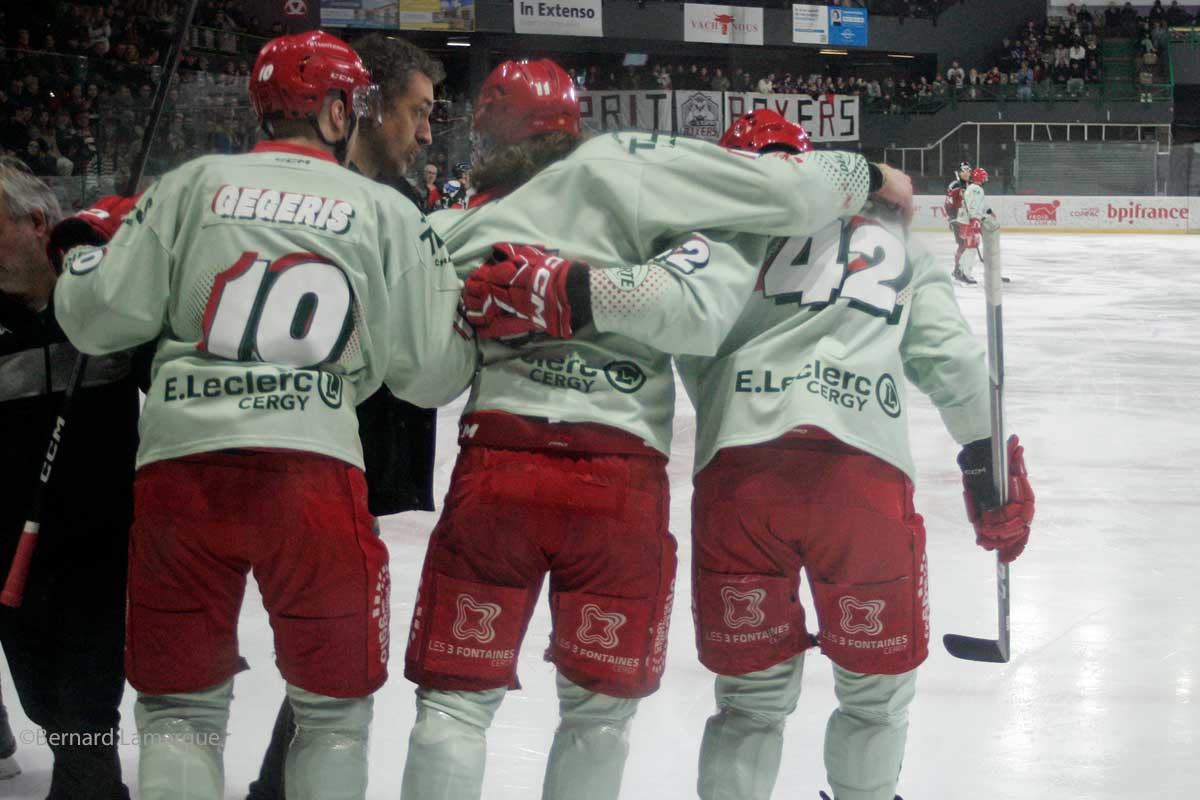 Bordeaux-Cergy, c’est 16 buts en 2 confrontations cette saison. La naissance d’une rivalité entre deux équipes qui ne s’aiment pas sur la glace. Et les fans bordelais auront pu le constater toute la rencontre. Un match à très haute intensité physique, où les pénalités ont plût. Un match à enjeux, avec la quatrième place en ligne de mire pour les deux formations. Un match gagné au forceps par les Boxers, qui se seront battus comme des chiens jusqu’à la fusillade, avant de voir Rudy Matima envoyer son palet au fond des filets d’Olivier Richard, pourtant héroïque tout le long du match. Car malgré le score de 5 à 4, cette rencontre aura été marqué par les performances des deux goals. 38 arrêts pour Victor Bodin, portier titulaire pour les Boxers en raison de l’absence de Quentin Papillon, qui aura brillé malgré des coéquipiers habitués à la perdre le palet bêtement tout le long du match, illustré par les buts d’Emils Gregeris (5 :58) et de Vincent Melin (16 :38) sur deux contre-attaques. La défense des Jokers aura tenu elle aussi, derrière Olivier Richard. Avec ses 35 arrêts, il aura maintenu en échec l’attaque bordelaise quasiment toute la rencontre, avant de céder avec sa défense dans le dernier tiers-temps.