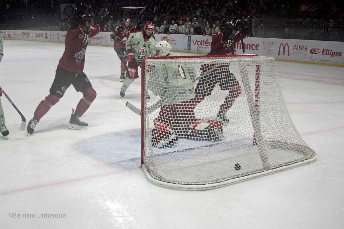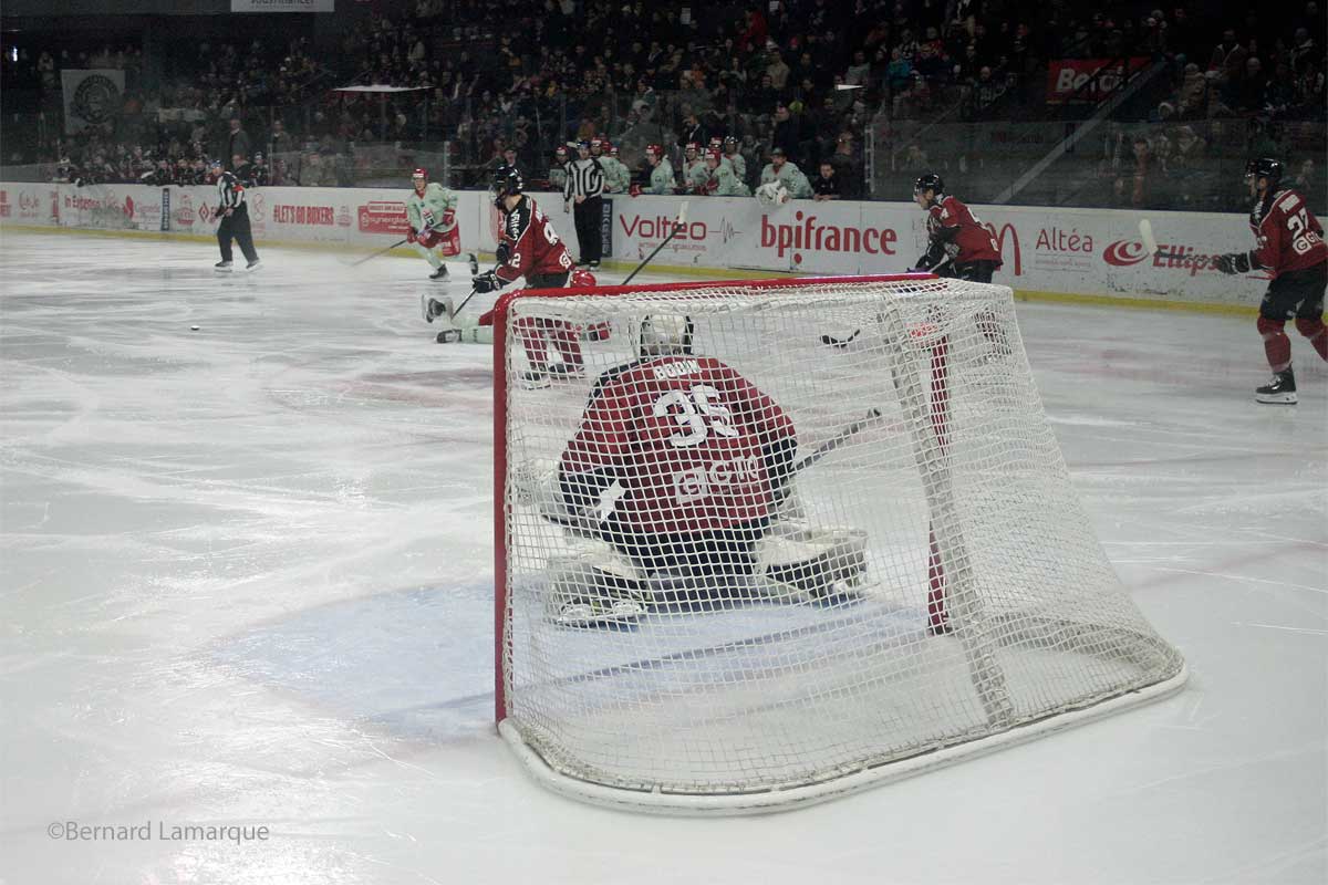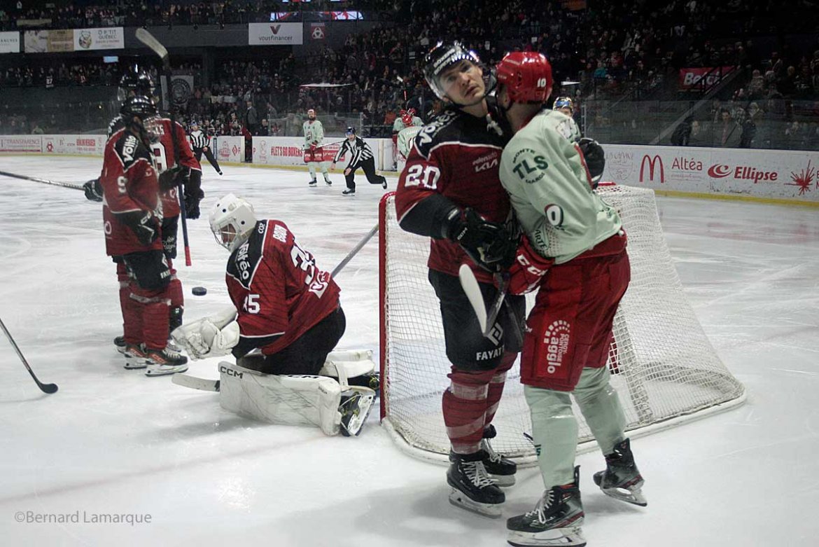 Une rencontre à deux visages pour le groupe d’Olivier Dimet, d’abord frustrants et déconcentrés, avec encore une fois un nombre de perte de possession beaucoup trop élevé pour pouvoir jouer sereinement puis plus adaptés permettant de revenir. Les Boxers ont ensuite complétement modifié leur comportement en fin de rencontre pour aller chercher la victoire, avec 3 buts dans le 3ème tiers-temps. Une révolte sonnée par Kévin Spinozzi, meilleur bordelais de la rencontre, mais surtout deux fois buteur (38 min 02 et 44 min 55), remettant les bordelais dans le jeu en fin de 2ème tiers-temps et qui égalisent en début de 3ème , sur deux frappes lointaines téléguidées dans la lucarne de Richard, pourtant impérial jusque-là. Une réaction qui apportera 5 buts dans le dernier tiers-temps, pour le plus grand désarroi des fans bordelais, qui ont vécu un véritable ascenseur émotionnel dans ce match, conclu par une séance de tirs au but réussie par les Boxers. Un match important pour les Play-Off, où les bordelais pourront regretter leurs largesses défensives qui leur coûte un point (la victoire sans prolongation valant 3 points, contre deux après prolongation). On peut regretter que les Boxers n’aient pas su gérer leur supériorité numérique pour tuer le match ou il encaisse un but en supériorité numérique. Prochain match samedi 30 décembre face à Gap, 10ème du classement. Un « must-win » pour accrocher la plus haute place possible en vue des Play-Offs. Il faut aussi souligner la performance du gardien numéro 2 de Bordeaux lors de la fusillade moins brillant dans le jeu courant car manquant de temps de jeu.