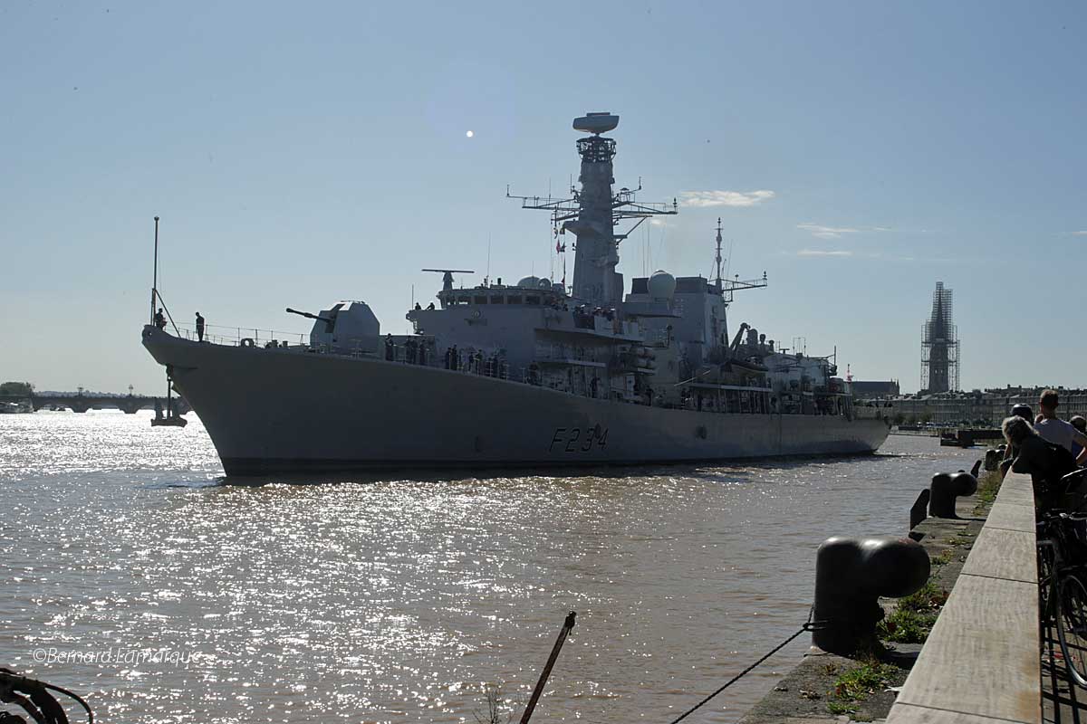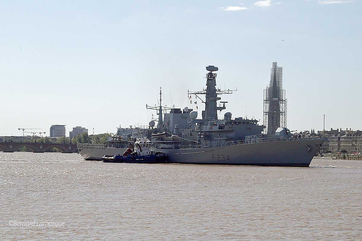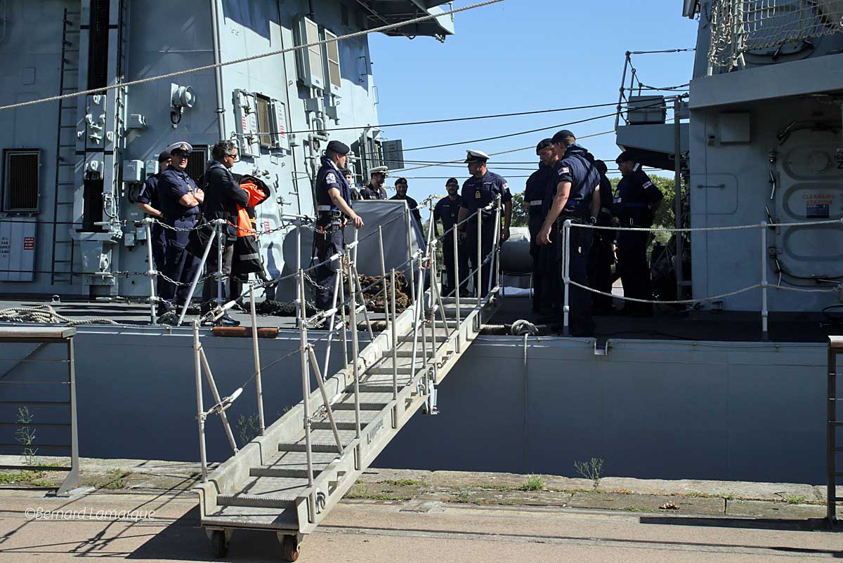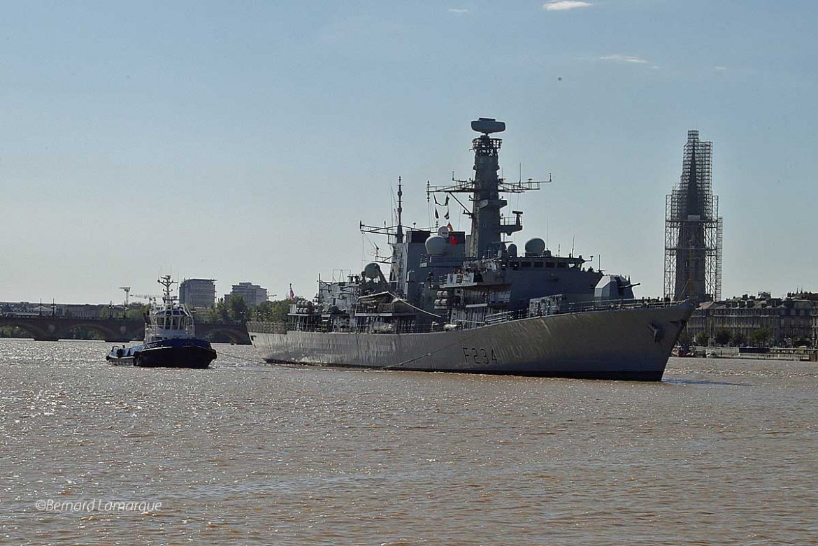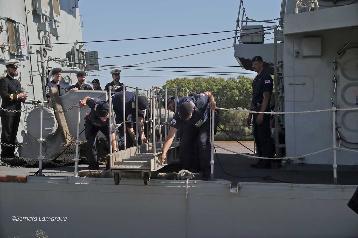 La frégate de la Royal Navy qui accompagne la venue de Charles III en France a accosté ce midi à Bordeaux et cela n’a pas été sans efforts car un tel "joujou" est très peu manœuvrant et il a fallu l’aide du remorqueur pour le pousser à quai correctement. Une fois à quai comme il n’est pas qu’il puisse être visité il a fallu démonter le bastingage sur le bateau et la barrière de protection du quai pour installer la passerelle qui a permis aux autorités de la marine et les autorités républicaines de monter à bord.