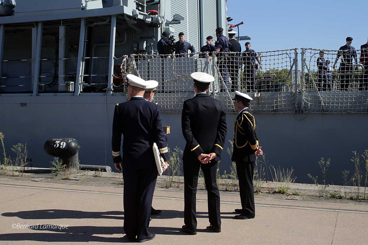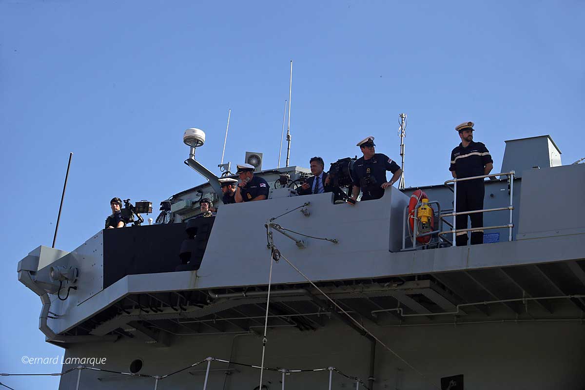 - Echange entre l’officier de port et le commandant de la frégate pour savoir ou on place la passerelle