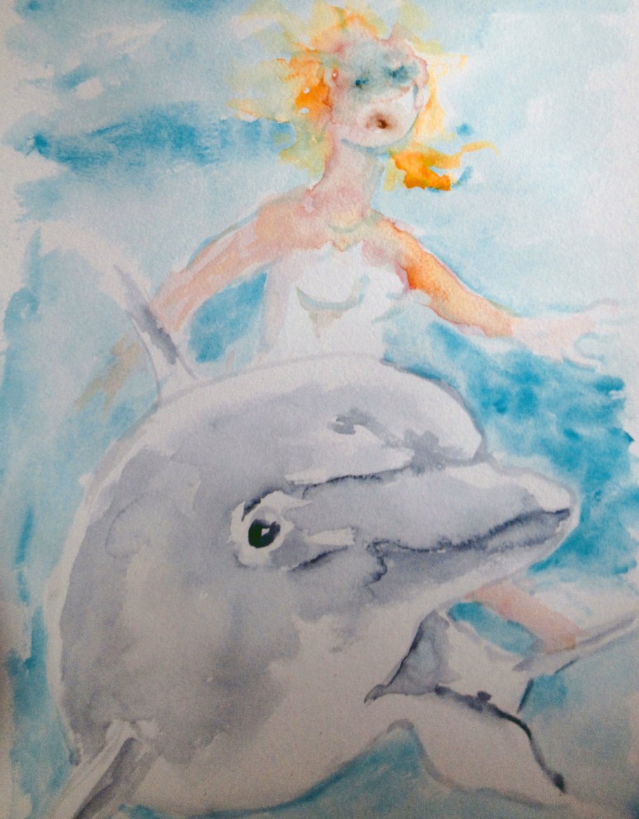 Ce fut si rapide qu’elle n’eut pas le temps d’avoir peur et le plus étrange, c’est que lorsqu’elle reprit ses esprits, elle ne ressentait aucune inquiétude, sinon au contraire une douce sensation de bien- être. Le manque d’air ne la gênait pas du tout, simplement, elle ne respirait pas. Elle regarda la chose qui la tractait par une cheville avec délicatesse et fermeté. Avec ravissement, elle découvrit un dauphin qui l’entrainait au loin dans les profondeurs de la mer.
