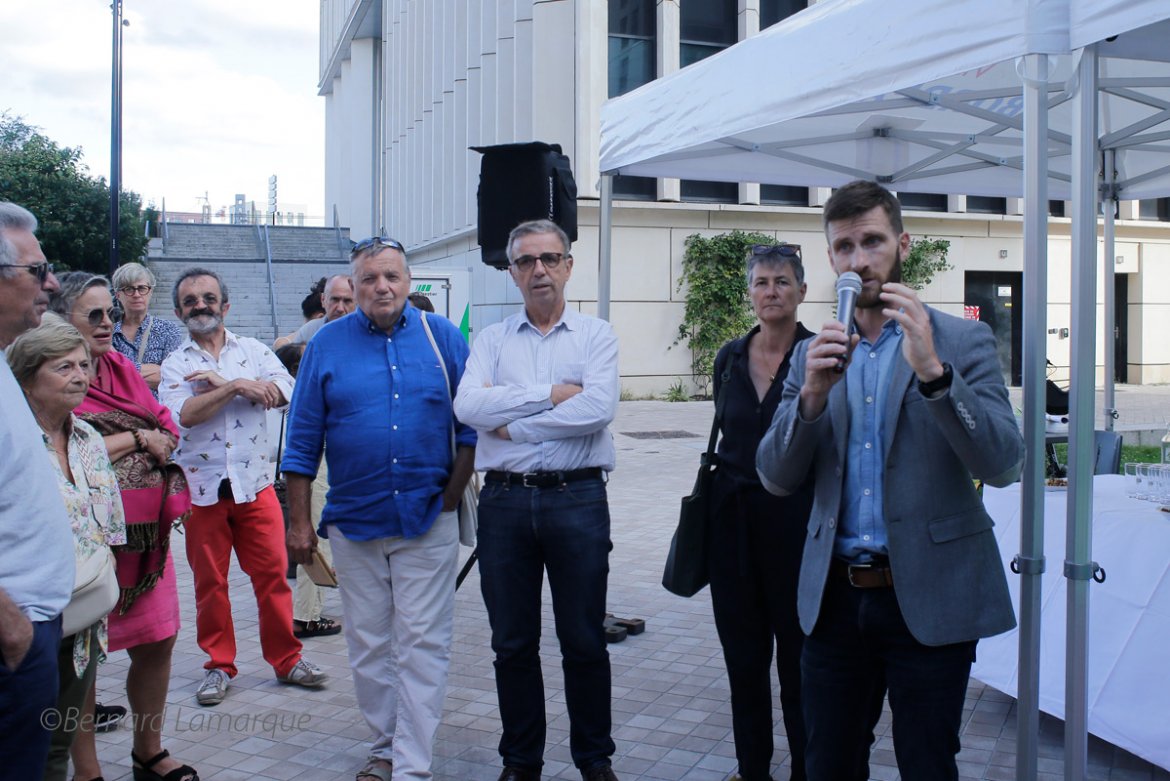 Pour cette venue sur la place des Citernes de ce nouveau quartier qui s’est construit de l’autre côté de la rue Amédée Saint Germain, le vingt et unième siècle s’est développé sous l’œil du dix neuvième créant un certain déséquilibre de population. Ce nouveau quartier des Citernes présente une curieuse configuration en forme d’olive coincée entre la rue Amédée Saint Germain et les rails de la SNCF dont on ne sait plus si on doit l’appeler comme cela. L’entrée en matière du maire pour cette visite est restée très sobre comme sur la pointe des pieds mais il avait fait suivre la force de frappe en la personne du maire de quartier de Bordeaux Sud Olivier Cazaux, Tiphaine Ardouin conseillère chargée de la démocratie permanente et de la gouvernance par l’intelligence collective qui contribue auprès de Delphine Jamet pour l’évaluation des politiques publiques et Marc Etcheverry du quartier Bordeaux centre Adjoint au maire chargé de la sécurité, la prévention de la délinquance et la médiation, ce dernier a du reste beaucoup pris la parole durant cette rencontre car il semble bien que la sécurité reste une question majeure dans la tête des gens et dans ce quartier. Bruno Retailleau s’emploie à mettre cette idée en avant sans qu’on puisse lui donner vraiment tord. A n’en pas douter la question prendra de la place dans la prochaine campagne électorale mais plus encore, la question qui en est à l’origine avec la drogue qui reste un soucis majeur pour les forces de police Nationale et dont la police Municipale pourrait donner la main.