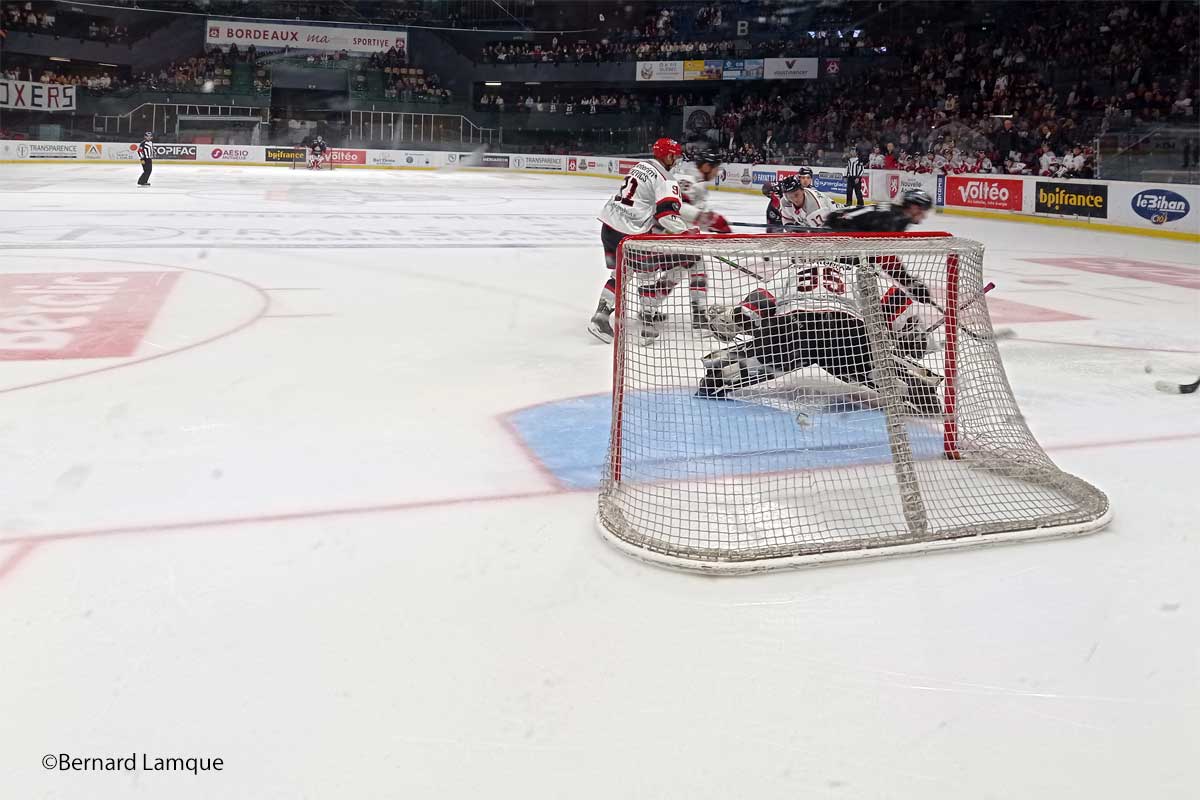 Les Boxers n’ont pas réussi à se débarrasser d’une équipe extrêmement collante et pas avare de mauvais coup, du hockey de tranchées où il s’agit de ne pas perdre et pour le jeu on verra après. Les Boxers se sont fatigués à tenter de consolider leur succès après avoir ouvert le score dans le premier tiers temps face à une équipe arc boutée en défense, jouant toujours à la limite de l’agressivité même si on sait que le hockey est un sport de contact mais la on est allé un peu au-delà. Les Boxers ont eu une désagréable surprise avec la sortie de Fouquerel qui s’est blessé sur une action qui n’a pas paru particulièrement violente et il a était remplacé par Gaëtan Richard dès la quatrième minute du début de la rencontre. Détail humoristique de cette rencontre avec le 50 de Nice plus grand joueur sur la glace et 50 de Bordeaux le plus petit et avec ce grand cinquante on a eu un exemple de brutalité avec une obstruction sur le gardien qui aurait du lui couter plus chère.