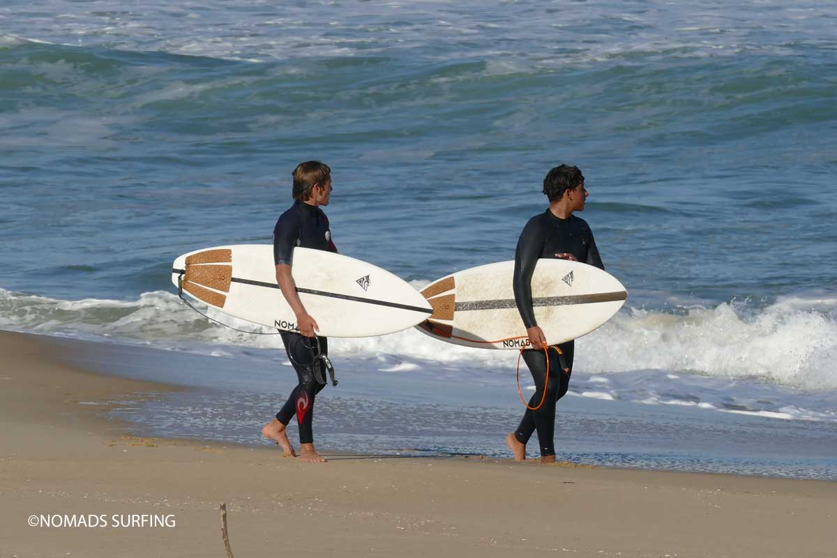 Ils ont fait la triste expérience des plages de détritus de Kuta à Bali aux déchets hivernaux sur le littoral aquitain. En parallèle, l’industrie du surf est en pleine explosion, mais c’est une industrie polluante du fait des matériaux utilisés pour la pratique (planches de surf, combinaisons). Les trois garçons décident d’agir, à leur échelle, pour préserver l’environnement et les océans tout en continuant à surfer. Nomads Surfing est née. L’un des premiers projets a été la création de planches de surf labélisées « éco-board » à empreinte carbone réduite, fabriquées à base de pains de mousse polystyrène en partie recyclé et à partir d’une résine époxy composée à 40 % de déchets végétaux ou encore de fibres naturelles de lin et de basalte. Parmi les autres produits de surf développés par la marque, on retrouve également de grands sacs de voyage pour les planches de surf provenant du recyclage des bâches évènementielles et upcyclées par un atelier solidaire à Bordeaux, Recup’R, Des collaborations sur les grips de surf 100% naturels, recyclables et biodégradables réalisés à partir de l’écorce de liège viennent compléter la gamme.