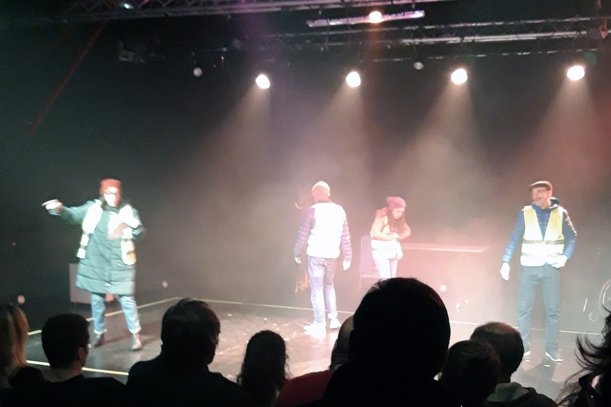 La scène s’ouvre sur quatre personnages qui conversent âprement sur un rondpoint, ce sont des « gilets jaunes » Ils ne sont pas là pour leur plaisir, il fait froid, ils risquent de perdre leur travail, ils sont désespérés, mais ils sont là pour contester. D’abord parce que le prix de l’essence vient d’augmenter, mais c’est la goutte de carburant qui a fait déborder le vase en déclenchant une immense colère restée jusqu’ici latente.