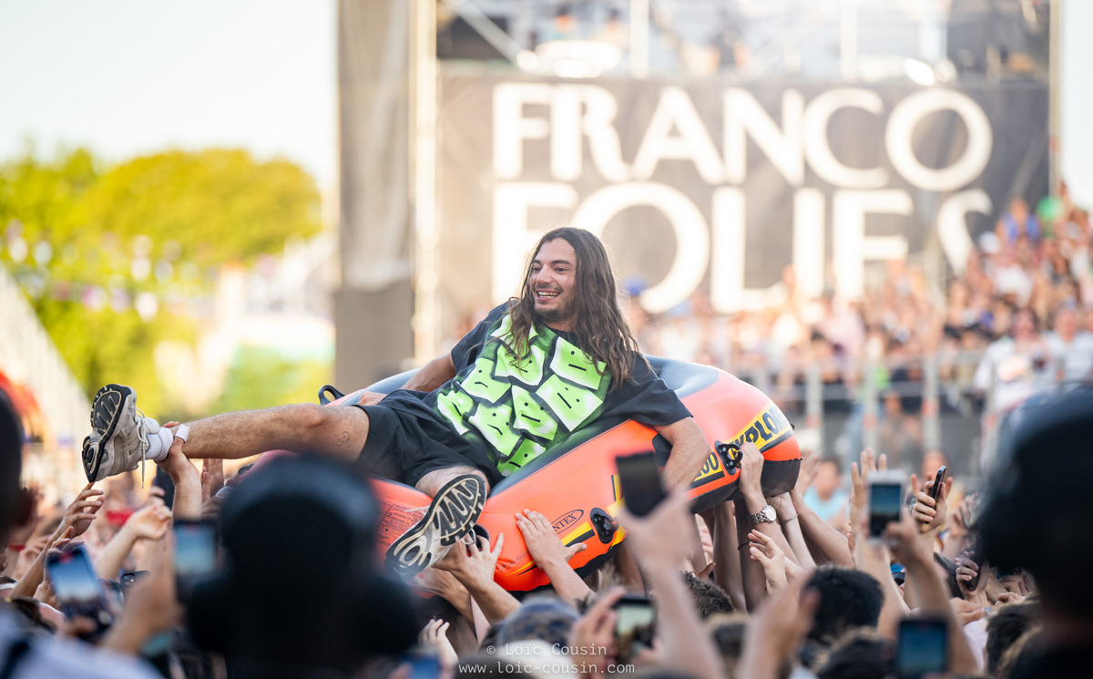 C’est ensuite Lujipeka qui, accompagné de sa belle voiture rose sur scène est venu faire chauffer la foule. Lucas de son vrai prénom a retrouvé le public qui l’avait impressionné lors de son passage avec le groupe Columbine en 2019, concert où il s’est remémoré être tombé dans les marches de la scène devant tout le monde. Chat noir, ou malédiction, le chanteur s’est blessé au genou pendant son concert d’hier, sautillant par moment sur sa jambe et faisant plusieurs fois les mouvements afin de s’assurer que cela n’était pas trop douloureux. Le concert quant à lui, est monté en puissance tout du long pour devenir lors de la dernière chanson un « océan du kiff ». En effet le chanteur est monté sur un bateau pneumatique afin de se faire porter par le public et ressentir de l’intérieur la ferveur pour lui et sa musique. Un show vraiment à voir en festival ou en salle tant le professionnalisme, la musique, le show et le sourire de Lucas vous feront passer un très bon moment.