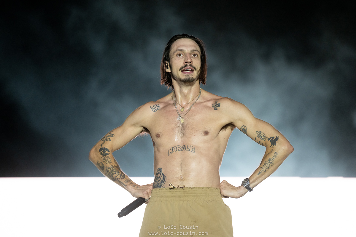 Roméo Elvis, n’a plus à prouver qu’il est un gros nom dans le rap, et le belge hier a une nouvelle fois tout donné. De la guitare sur scène, des morceaux que tout le monde connait comme « Soleil », « Chocolat », et « Malade », un show visuel avec les écrans derrières, et une chaleur qui est montée sur scène au point que Roméo Elvis a commencé chemise fermée pour finir torse nu. La générosité du rappeur, sa joie d’être sur scène se ressent à chaque instant, et le rend comme il se doit aux festivaliers qui connaissaient par cœur toutes les chansons du rappeur belge et frère d’Angèle.