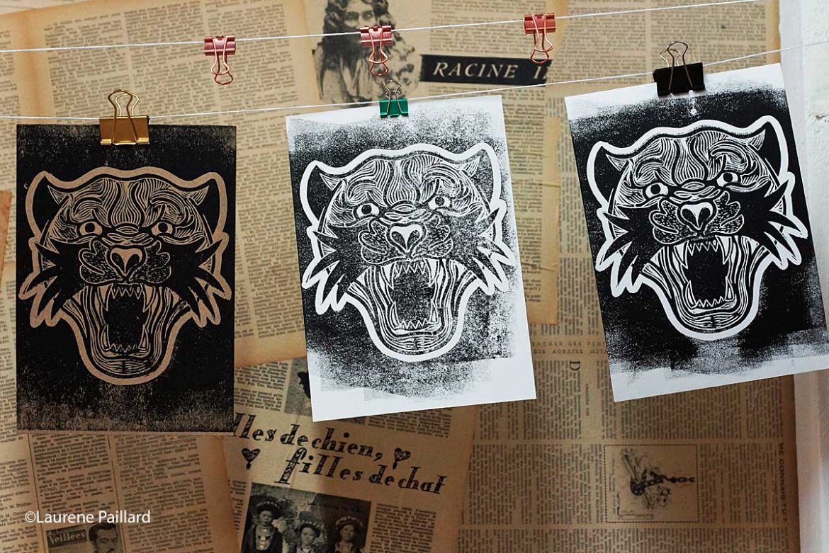 En plus du papier, elle imprime certaines de ses gravures sur du tissu pour créer des objets à porter sur soi tels que des bandanas et des sacs, mais aussi des œuvres suspendues comme des kakémonos. Elle fabrique son propre papier recyclé, qu’elle utilise comme support pour ses impressions. Cette technique lui tient particulièrement à cœur, et elle aspire à utiliser exclusivement son propre papier dans son art. Depuis un an, elle anime des ateliers d’initiation à la linogravure et donne des cours pour enseigner sa pratique.