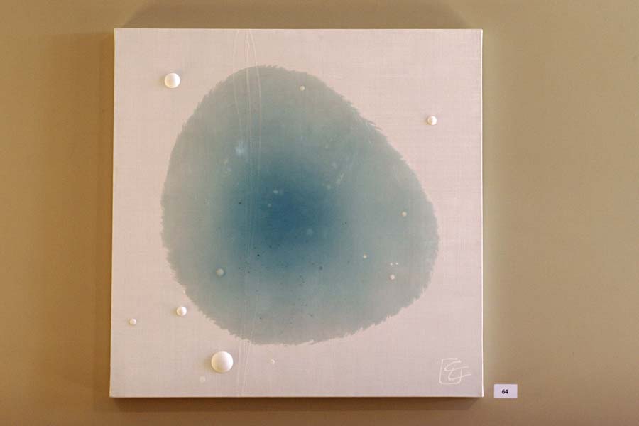Catherine Ludeau, née à Paris et diplômée de l’Ecole des Arts Appliquées Dupéré, présente « Source », oeuvre (n°64) de résine et acrylique sur toile. Sa représentation de Never Give Up par une « cellule » bleue pastel sur fond blanc invite le visiteur à se recueillir au plus profond de son unité de vie la cellule associant eau et informations vitales pour trouver l’énergie de ne jamais renoncer.