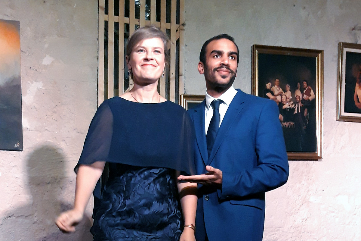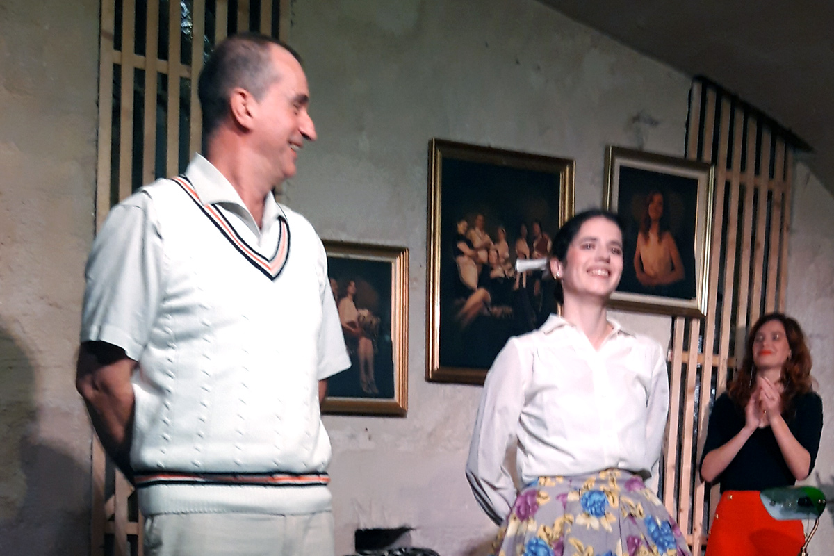 Déjà deux personnages déboulent sur la scène. Louise jouée par Julie Lagnier et Yves interprété par Arnaud Baudouin. Un couple passionné, mais tous deux sont mariés chacun de leurs côtés. Nous sommes au cœur d’une fête qui s’annonce peut-être mouvementée. Une servante sur vitaminée usant de fourberie est jouée par Margaux Langlest. L’épouse légitime Marie, plus lucide qu’il n’y parait, interprété par Christine Stadler. Éric est Olivier Bureau, le mari papillonnant de Louise, viennent ensuite un couple ami Julie, Solène De Sagazan et Paul, Christophe Sardain.