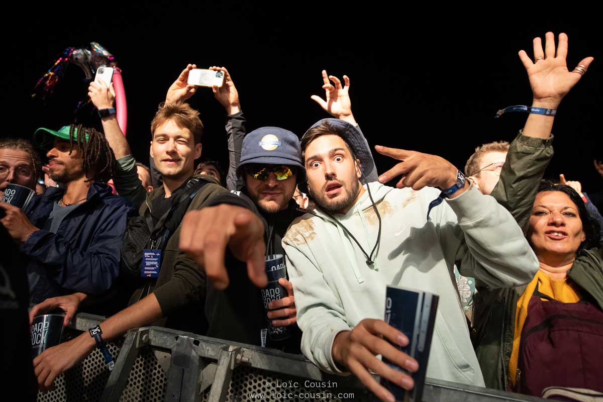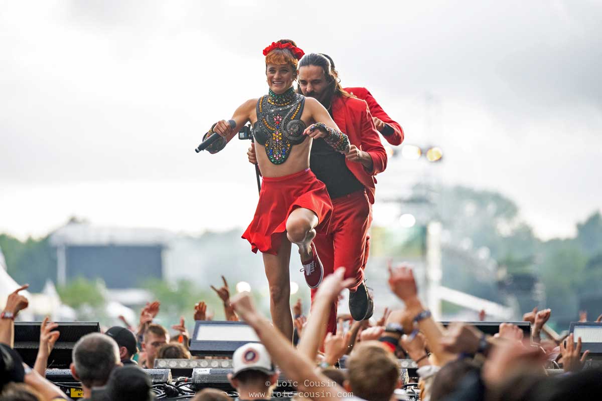 C’est ensuite le groupe moustache de Deluxe, qui est arrivé en costard rouge, pour sa pop funk qui a mis tout le monde d’accord. Peu importe la pluie, Liliboy, Kilo, Kaya, Pietre, Soubri, Pépé ont mis le feu allant même plusieurs fois sur l’avancée de scène malgré la pluie, Pépé, lui, est même descendu dans le public (et la boue), pour sentir un peu plus la ferveur. Une setlist d’une heure, efficace avec les titres « Barcelonette », « Tum Rakak », « Pony ». Il était cependant, difficile parfois, de voir les visages au premier rang totalement dénués d’expression, tant le seul concert attendu pour certains était PNL, mais c’est visiblement ça aussi la nouvelle génération qui n’est pas ouverte à la découverte et qui vient dans un festival comme on vient au concert d’un seul artiste en salle.