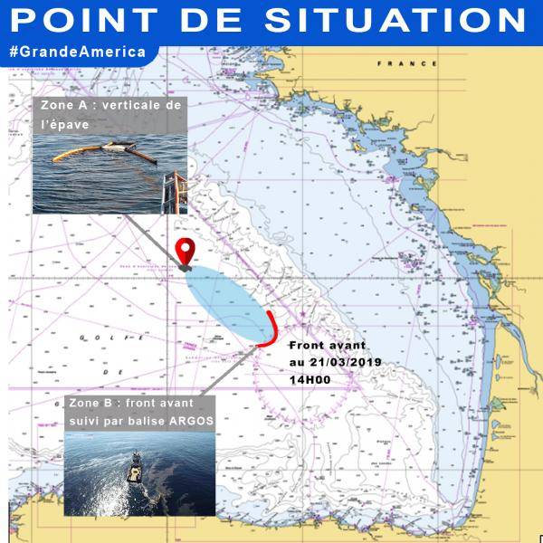 Des vols aériens de surveillance maritime ont eu lieu à ce jour ; ils sont le fait d’aéronefs de la Marine Nationale : Falcon 50, Atlantique 2, hélicoptères Caïman et Dauphin. Ces opérations ont permis de repérer des conteneurs en dérive… Compte-tenu des conditions météo et océanographiques dans le Golf de Gascogne, une arrivée d’amas de fioul sur le littoral français " semble très peu probable avant 10 jours."