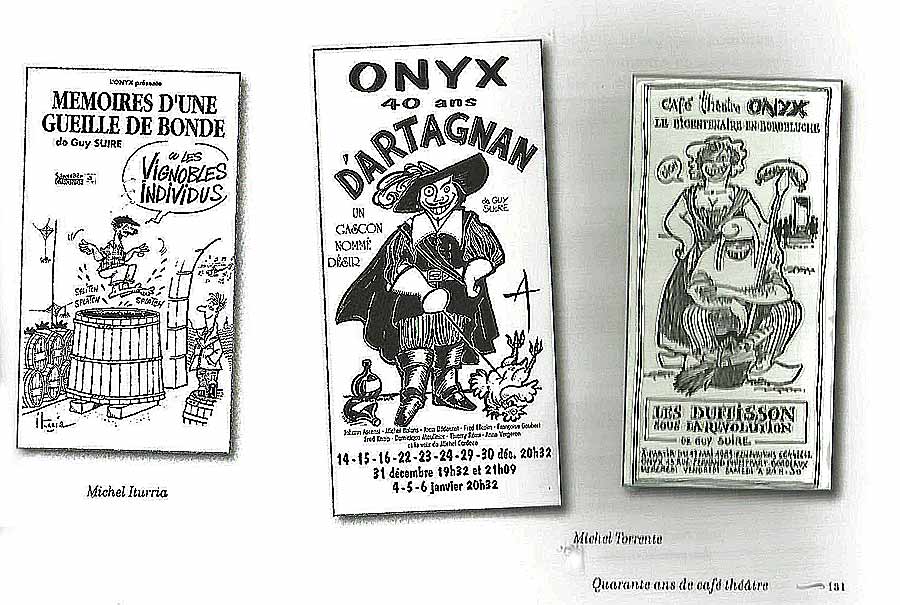 Pour ces quatre jours de représentation, il reprend une de ses plus célèbres pièces, jouée plus de deux cent fois à l’Onyx, exactement 232 comme il le souligne lui même : "D’Artagnan, un gascon nommé désir" avec ses acteurs fétiches : Jean Bédouret, Béatrice Deplanne, Jean Marc Foissac, Frédéric Kneip, Thierry Rémi qui l’ont accompagné durant toutes ces années qui ont fait la gloire de l’Onyx chacun ayant campé un personnage phare d’une des quinze pièces écrites par Guy Suire la seizième co-écrite avec Gabrielle Russié et la dix-septième avec Guilleragues. Dans les murs de l’Onyx se sont jouées toutes sortes d’auteurs du plus classique comme Molière ou Racine au plus contemporaines avec les impromptus à loisirs d’Obaldia (Le défunt, Le sacrifice du bourreau) prouvant en cela que l’Onyx c’était avant tout de la scène et du théâtre au delà de ce d’Artagnan à l’expression particulière. Il ne faut pas oublier que l’Onyx s’est produit hors les murs en allant porter son spectacle des "Gueilles de Bondes" au contact des viticulteurs parfois à la demande du défunt Conseil Général qui ne fut jamais très généreux avec ce chantre de la vie locale girondine et du parlé bordeluche. Laissons à Noël Mamère écrire ce que le lieu est pour lui : " L’Onyx se fut la découverte d’Arrabal, d’Obaldia, de Beckett, ce furent Huchett, Balavoine, Mayereau, Bourgeix, Lillet... Et c’est surtout un ami, Guy Suire ; 35 ans de fidélité, 35 ans d’amitié. Et toujours ce désir fou de reprendre la guitare et de retrouver les tréteaux. Chiche !" Pourquoi pas maintenant qu’il a décidé d’abandonner sa carrière d’élu politique commençée à Libourne au côté de Gilbert Mitterrand en juin 1988.