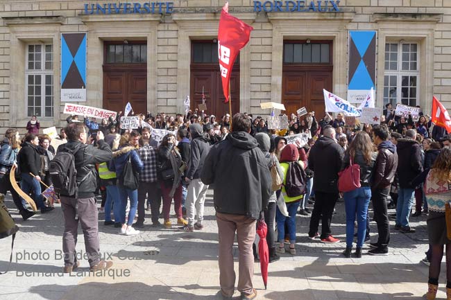 Dans l’ordre des slogans que du classique « El Khomry t’es foutue la jeunesse est dans la rue » , « El Khomry si tu savais ta loi où on se la met ! » et quelques quolibets humoristiques avec son nom, bien sur, super classique la bataille des chiffres entre organisateurs et Préfecture qui iront du simple au divisé par dix. Ce qui est sûr c’est qu’à Bordeaux, il n’y a pas eu de giboulées pour mouiller le pétard de la manifestation qui aux dires de certains n’est qu’un début. A l’heure où Place de la Victoire les manifestants se rassemblaient, sur RMC Eric Brunet volait au secours de la loi en fustigeant la présence des lycéens et des étudiants sur la manifestation. Bien sûr qu’il a le droit d’être de droite mais quelque part c’est donner un brevet de droite à Hollande car en fait si le nom d’El Khomri est mis en avant c’est Hollande et Valls qui sont visés. Il faudrait d’ailleurs suggérer à Eric Brunet de faire une émission sur le coût des retraités de la République histoire de voir ce qu’on pourrait récupérer en les mettant dans un cadre décent. Parcours hyper classique de la manifestation qui a vu grossir son flot tout du long. De nombreux retraités se sont joints au cortège et il apparaît bien qu’un frémissement protestataire profond est en train de naître et de se lever avec une tendance jusqu’au-boutiste. De son côté Jean Lassalle qui sera peut être candidat à la présidentielle regrette qu’on prenne des décisions sans en discuter avec les gens concernés mais c’est bien ce qui caractérise ce gouvernement soi disant de dialogue. Il n’y a plus qu’a attendre la suite car il y en aura une !