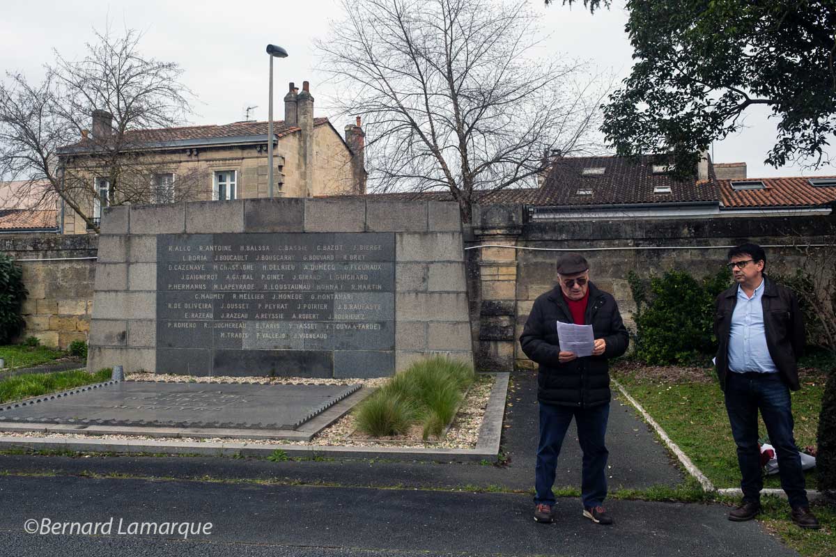 C’est bien de cela dont il s’agit de cette nationalité française qu’implicitement tous espéraient et qui n’a pas forcément été reconnue à tous ces combattant étrangers évoqués dans le poème de Louis Aragon "L’Affiche Rouge " mis en musique par Léo Ferré "Nul ne semblait vous voir Français de préférence". C’est ainsi que dans son discours Jean Lavie, président de l’Association du souvenir des fusillés de Souge a eu l’occasion de rappeler ramenant la commémoration à la dimension bordelaise et girondine "que parmi les 256 fusillés de Souge victimes des nazis et de la police vichyste, 26 étaient nés à l’étranger (un parmi eux avait été naturalisé en 1938), auquel s’ajoutait un descendant né de parents étrangers, soit 11%. Parmi eux on dénombre 9 espagnols, 6 soviétiques, 5 italiens, 2 polonais, 2 allemands, 1 roumain, 1 hongrois, 1 haïtien", tous se considérant en "soldat régulier de l’Armée française de la Libération". On peut retrouver plus de détail sur la page Souge (Gironde), 1940 - 1944. La municipalité était présente en la personne d’Olivier Escots qui a aussi pris la parole au cours de cette manifestation très symbolique où le Parti Communiste a honoré un des siens, entré au parti communiste en juin 40. Missak et Mélinée Manouchian font leur entrée au Panthéon le 21 février 2024, quatre-vingts ans jour pour jour après l’exécution de Missak.