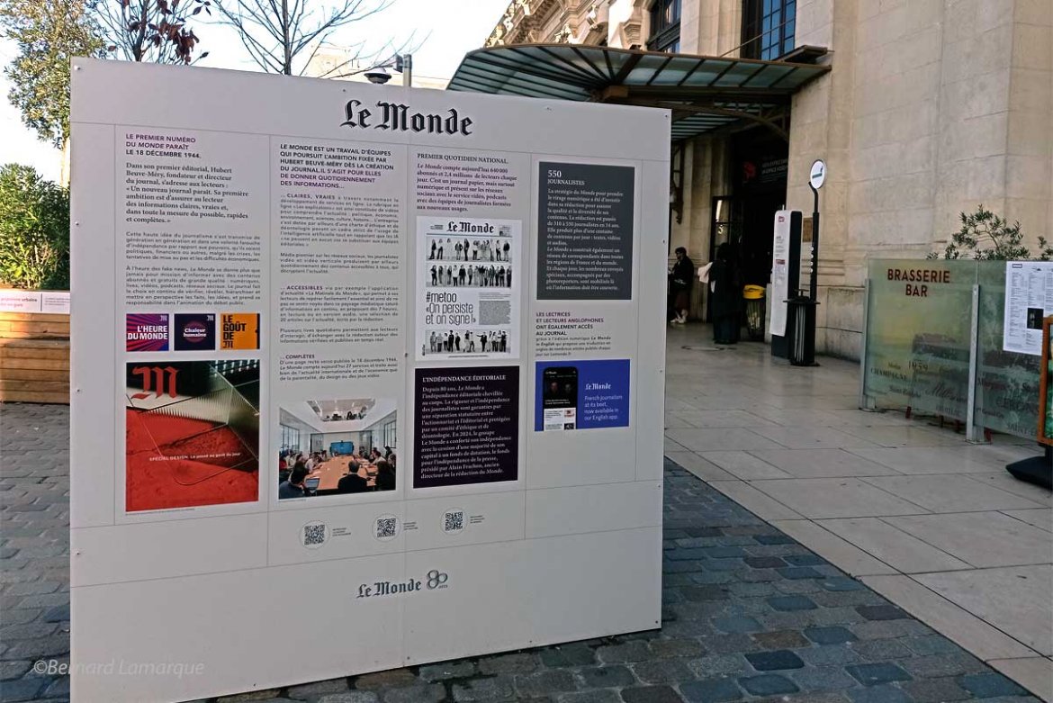 C’est sur le parvis de la gare Saint Jean qu’un hommage est rendu au journal Le Monde pour ses 80 ans et la gare de Bordeaux n’est pas la seule car cet hommage est affiché dans 15 grandes gares françaises.