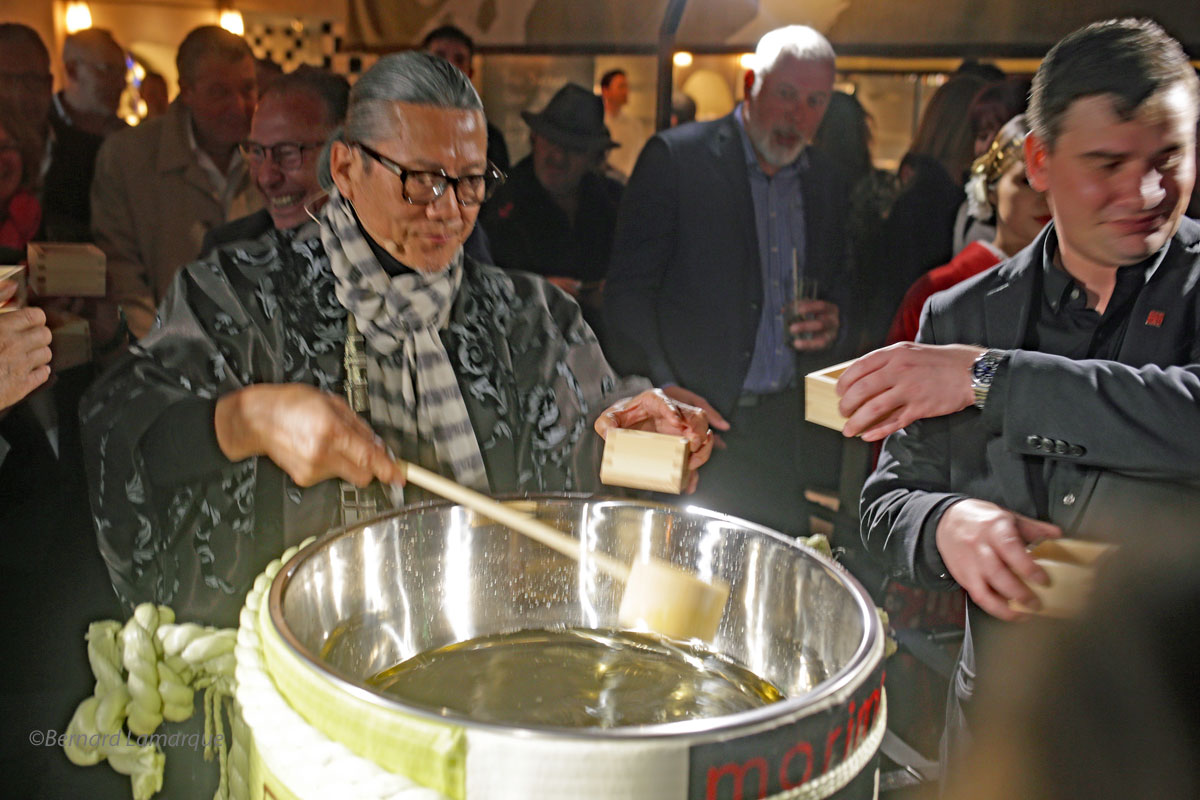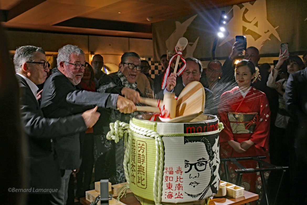 En fait le support de cette soirée a été, pour l’essentiel, l’inauguration du restaurant du chef Morimoto qui est le point de restauration de ce Mondrian Bordeaux les Carmes et qui sera surement l’adresse de ceux qui voudront expérimenter la cuisine chinoise. Cette dernière pour être plus accessible est mâtinée de gout européen car la cuisine japonaise traditionnelle est plus difficile à aborder car pour l’instant l’essentiel de la cuisine japonaise repose sur les Sushi. L’inauguration a donc été menée à la manière japonaise en fracassant le couvercle du tonneau de Saké dont le contenu va être partagé par les invités. Le chef Morimoto après avoir fracassé le couvercle du tonneau avec en particulier le maillet attribué à l’ancien Président de la République était décorée d’un ruban bleu, blanc, rouge. Il a ensuite servi le Saké aux invités de marques pendant qu’une escouade de serveuses et de serveurs circulaient avec des verres remplis de Saké dont tout le monde a pu en profiter à large main.