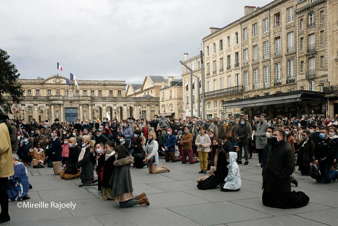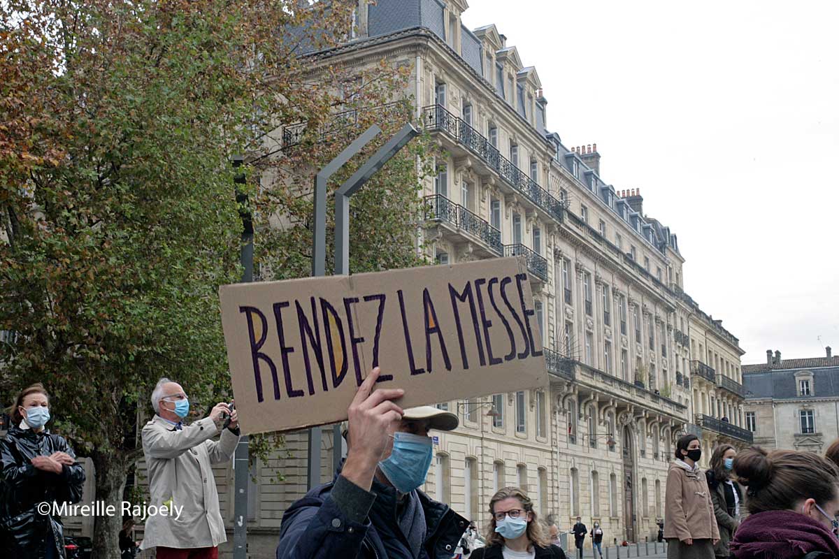 Un groupe de jeunes qui n’ont pas eu froid aux yeux ont organisé une manifestation qui a réuni au moins 1000 personnes, ce dimanche matin à 11 heures en plein centre non seulement devant la cathédrale, mais clin d’œil à la municipalité, devant la mairie puisqu’ils partagent la place Pey Berland à eux deux. L’incohérence des autorités est à faire frémir, car depuis de nombreuses années, le Vendredi Saint, un chemin de Croix est organisé à Bordeaux, dans le Centre-ville (départ place de la Bourse, arrivée dans la Cathédrale en passant par la rue Sainte-Catherine) et à cette occasion, de nombreux catholiques s’agenouillent lors des différentes stations du Chemin de Croix. Pourquoi, ce qui ne posait aucun problème jusque là doit-il brusquement en devenir un ? Pour le peuple catholique, il n’est pas question de se mette à genoux devant le pouvoir politique (du reste c’est interdit d’après lui !) pour de mauvaises raisons. Les propos tenus par les organisateurs de la manifestation de protestation sur la suppression de la messe étaient plutôt vifs en dénonçant les menaces des autorités vis à vis d’eux contre toute forme de prière publique. "Personne ne peut nous dire comment il faut prier !" a fait remarquer un des organisateurs. "On nous menace de graves sanctions si notre prière est un mouvement de revendication" avait-il cité auparavant en précisant qu’ils avaient reçu des menaces au téléphone de la part de la police samedi soir.
