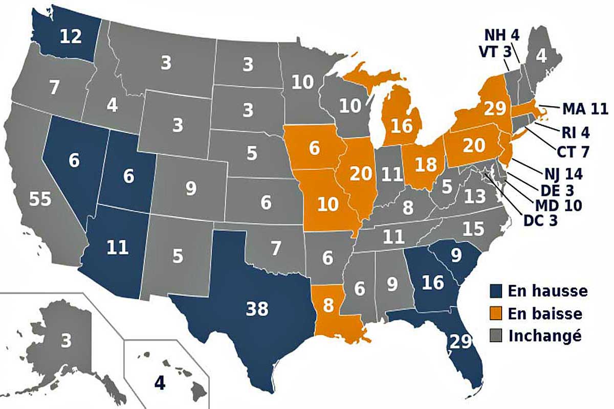 - Les Etats qui pèsent lourds dans la désignation (Californie 55 - Texas 38 - Floride 29 - New York 29 - Illinois 20 - Pennsylvanie 20 - 18 Ohio - Géorgie 16 - Michigan 16 -Virginie 15 - New Jersey 14 - Caroline du Nord 13 - Washington 12 - Arizona 11 - Massachussetts 11 - Tennessee 11 - Indiana 11