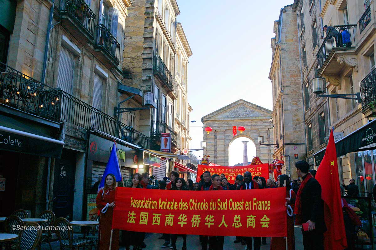 C’est sous le soleil à la Victoire que tout a commencé avec un nombre impressionnant d’enfants plus ou moins habillés style chinois ainsi que quelques adultes. Cette fête est en passe de devenir une date incontournable à Bordeaux avec le nombre important de chinois qui réside non seulement à Bordeaux comme les étudiants mais on en rencontre dans tout l’Aquitaine. Le cortège s’est ébranlé sous la conduite de Stéphane Domecq marquant chaque étape afin que tout le monde puisse réaliser la bonne photo en souvenir de cette bonne journée