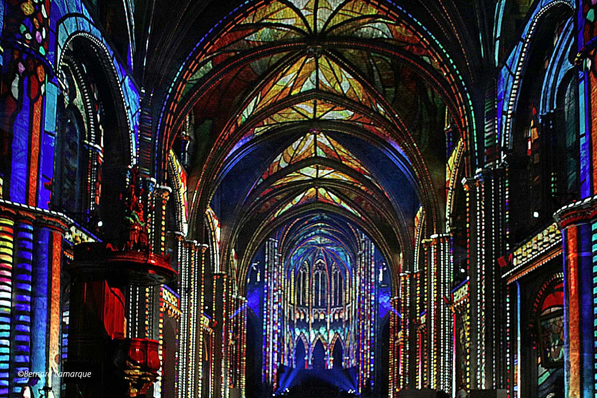 En se fracturant à travers les vitraux, les faisceaux de lumière du soleil transforment continuellement la perception de l’édifice, dans un ballet lumineux majestueux qui évolue de l’aube au crépuscule.