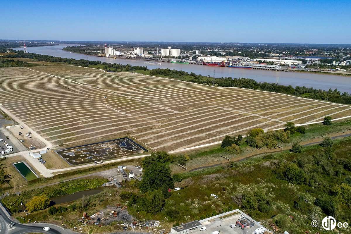 C’est la plus grande centrale européenne photovoltaïque en milieu urbain puisqu’elle est implantée sur le territoire de la ville de Bordeaux avec ces soixante hectares qui vont accueillir tous ces panneaux photovoltaïques permettant de transformer l’énergie lumineuse en courant électrique continu. C’est donc sur une décharge dont on estime qu’elle contient entre 2 et 3 millions de m³ de déchets que la centrale est en cours d’installation. Cette décharge a été réhabilitée entre 2004 et 2009, elle est aujourd’hui recouverte d’un géotextile et d’une couche de terre végétale qui laisse apparaître un enherbement qui reste pauvre et peu fourni.