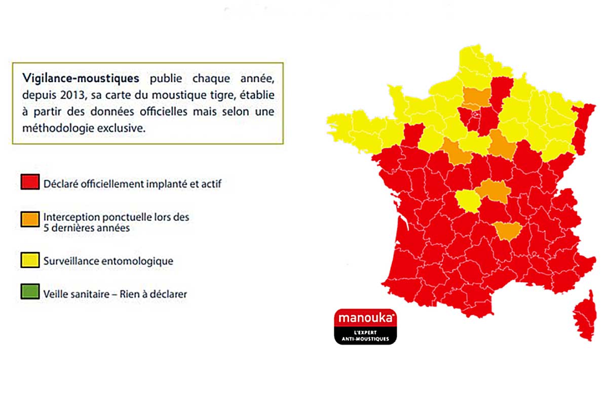 Cette année encore, ce sont 6 nouveaux départements qui passent en vigilance rouge, c’est à dire que le moustique tigre a été déclaré officiellement implanté et actif sur ces territoires, ce qui fait monter le chiffre à 64 désormais colonisés sur les 96 départements métropolitains.