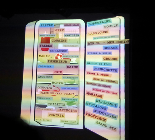 À l’entrée du théâtre, les comédiens nous ont abordés pour nous demander de leur trouver des expressions pour alimenter leur frigidaire littéraire, et nous préparer en quelques minutes un petit menu de leur composition. Celui-ci, rapidement bien garni, constitua une liste hétéroclite de 50 mots dans lequel ils ont dû piocher pour nous cuisiner ce fameux « frichti ».