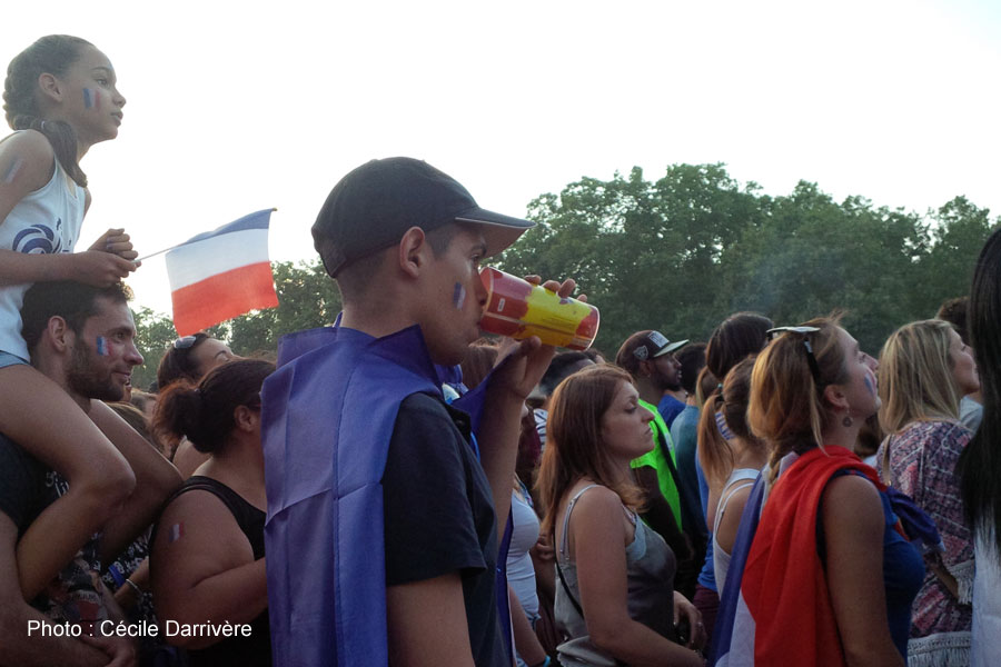 Tout au long de cet Euro, la deuxième plus grande Fan Zone de France a accueilli de nombreux supporters de toutes nationalités. Pour ce soir de finale, ce sont les Français qui occupent en majorité la place. La foule avance lentement à l’entrée et passe les fouilles de la sécurité. A l’intérieur, l’espace est rempli. Pour accéder aux buvettes, il faut compter entre 40 et 50 minutes d’attente. Si le temps peut paraître long, les supporters restent calmes. L’ambiance est à la fête et la musique et les chants occupent les spectateurs qui attendent le début du match. Le problème majeur, à la Fan Zone, c’est que les personnes de moins d’1m80 ne voient rien au match. A moins d’arriver quatre heures à l’avance, on se retrouve plongé dans une marée de dos, à lutter pour apercevoir un bout d’écran. On suit alors le match en écoutant les réactions des supporters, des cris de joie aux concerts de protestations. La première mi-temps est ponctuée de chants et d’encouragements. Tout le monde croit à une victoire de la France, et les quelques supporters du Portugal restent discret. Lorsque Cristiano Ronaldo doit quitter le stade, toute la Fan Zone applaudi de bon cœur. A la mi-temps, on note un net mouvement des populations vers les buvettes. L’appel de la bière fait bouger les foules. Certains ont malheureusement abusé de la boisson et une bagarre menace d’éclater.