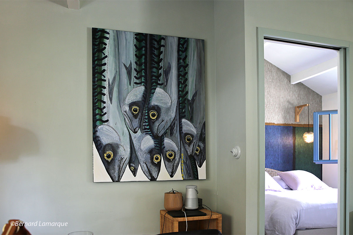 Pour élargir sa gamme d’accueil et d’hébergement, Anne Guiot a donc imaginé d’externaliser ses possibilités d’hébergement pour ses clients en offrant un lieu inédit dont la décoration et l’aménagement procède uniquement de ses choix avec le travail des artisans locaux dont un qui travaille le bois avec des chênes d’âge remarquables car très anciens. C’est ainsi qu’ elle a acquis dans le port de Piraillan une cabane de pêcheurs qui a abrité une famille avec deux enfants pendant de nombreuses années pour la transformer en lieu d’accueil hôtelier pour un couple et un enfant avec un confort maximal dans un décor guidé par le choix artistique d’Alice 01001100 en termes de couleur avec ses fameux "harengs" dont le tableau orne le séjour de ce nid douillet. Dans ce lieu tout est travail artisanal dans l’aménagement comme la décoration influencée par à une artiste ou l’on découvre la dominante des tons employés pour colorer le lieu. La céramique artisanale est aussi une invitée de marque de cet espace et s’exhibe sous toutes ses formes : sols, murs mais aussi luminaires, vaisselle, accessoires, mobilier pour donner un cachet unique à la couleur des eaux du bassin. L’originaire d’Arès se déplace avec familiarité dans ce monde du Bassin d’Arcachon qu’elle connaît bien et dont elle apprécie l’ambiance. Tout ceci l’a amené à élargir ses possibilités d’accueil sur le Bassin d’Arcachon aussi au Canon et nous y reviendrons dans un autre article qui parlera de cette quatorzième chambre de l’Hôtel Yndõ.
