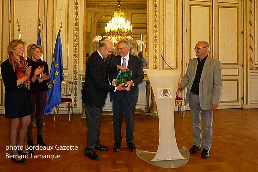Marc Olivier, Directeur honoraire de l’ANEV était présent pour cette cérémonie qui d’autre part a rassemblé autour d’Alain Juppé, Sylvie Cazes, Présidente de la Fondation pour la culture et les civilisations du vin, Philippe Massol, Directeur Général de la Fondation car c’est à travers la Fondation et la Cité du Vin que la ville de Bordeaux hérite de ce prix hautement distinctif pour la ville de Bordeaux et sa cité des Civilisations du Vin. Étaient aussi présents pour cette remise de prix : Maribel Bernard, adjointe au Commerce, Nathalie Delattre, nouvelle sénatrice de la Gironde, Pierre De Gaétan Njikam-Mouliom, hargé des partenariats avec l’Afrique, Emmanuelle Cuny adjointe en charge de l’éducation ainsi que des personnels de la Cité du Vin, bien présents pour l’occasion