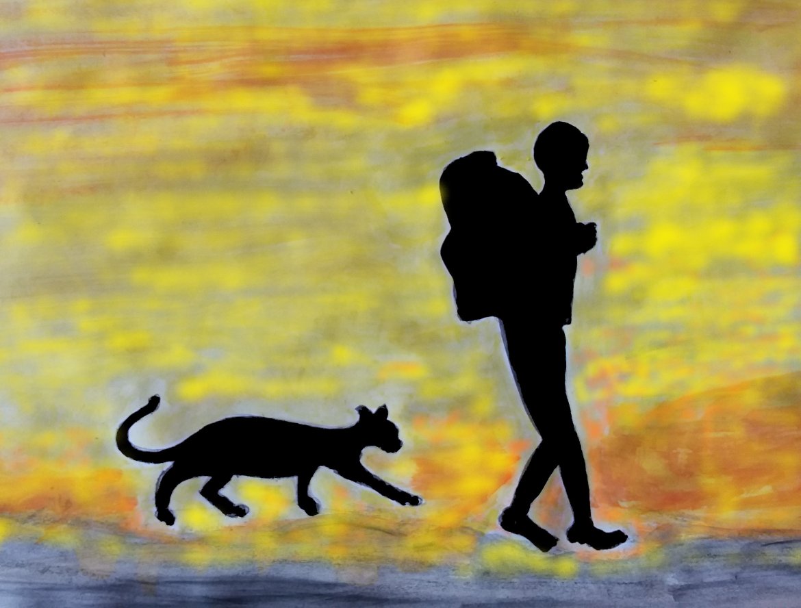 Il avait saisi par je ne sais qu’elle merveilleuse intuition que j’adorais le poiss’... enfin, les boites de conserve. Les jours qui suivirent, un rituel qui devint une habitude s’instaura. Au matin, je me glissais dans le sac alors qu’il faisait encore nuit et Harry quittait le gite. Au bout de ce que je supposais être des heures, je sortais ma tête à l’air libre et je regardais le chemin par-dessus son épaule. C’était assez agréable je goûtais tout à fait passif, le rythme régulier de ses pas. Au bout de quelque temps, quelque chose changea. Les humains qu’il croisait parlaient étrangement. Les mots roulaient dans leurs bouches et je ne comprenais plus rien, Harry par contre, comme s’il s’y était attendu, s’adapta très bien et il fit comme eux, je crus bientôt que je pourrais y arriver moi-même, il semblait qu’il suffise que je finisse mes miaulements par des oh ou bien des ah. Cela, c’était juste avant la tragédie. »