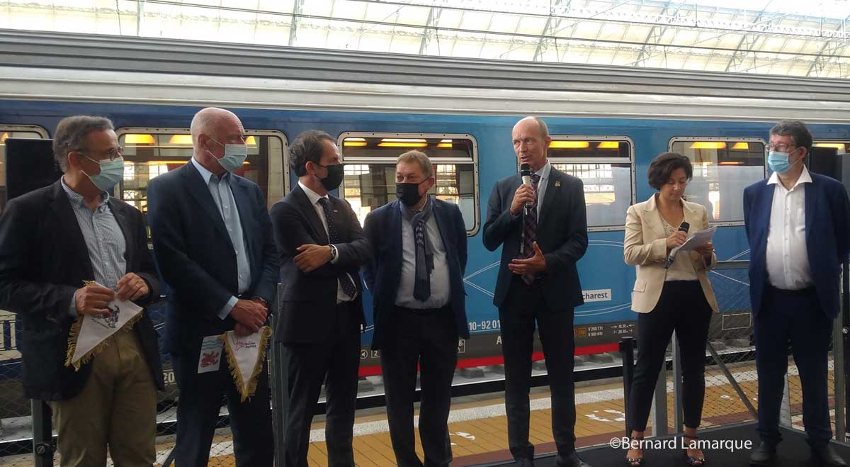 Arrivé vers 17 h 30 en gare de Bordeaux Saint-Jean en provenance d’Hendaye alors qu’il avait entamé son périple au départ de Lisbonne le 2 septembre, après étape à Madrid le 3 septembre, il a donc été accueilli à Bordeaux où Pierre Hurmic, maire de Bordeaux, Alain Anziani, président de la Métropole et Alain Rousset, président de la Réqion Nouvelle Aquitaine ont reçu Christophe Fanichet, président directeur général SNCF voyageurs, Marc Papinutti, directeur général infrastructure des transport et de la mer, Hérald Ruuters, directeur investissement des transports innovants et durables à la direction générale de la mobilité et des transports de la Commission Européenne pour un échange animé par Maud Guillaumin autour de la réalité des déplacements durables, écologiques et surtout dispensant le moins de carbone possible. Les locaux de l’étape se sont ouverts des difficultés de transports dans leurs sphères respectives avec pour Bordeaux et la Métropole le problème essentiel de pouvoir relier le plus rapidement possible des points extrêmes de la Métropole avec le problème lancinant du dernier kilomètre qui est parfois très complexe à résoudre car les moyens collectifs ne desservent pas chaque adresse.