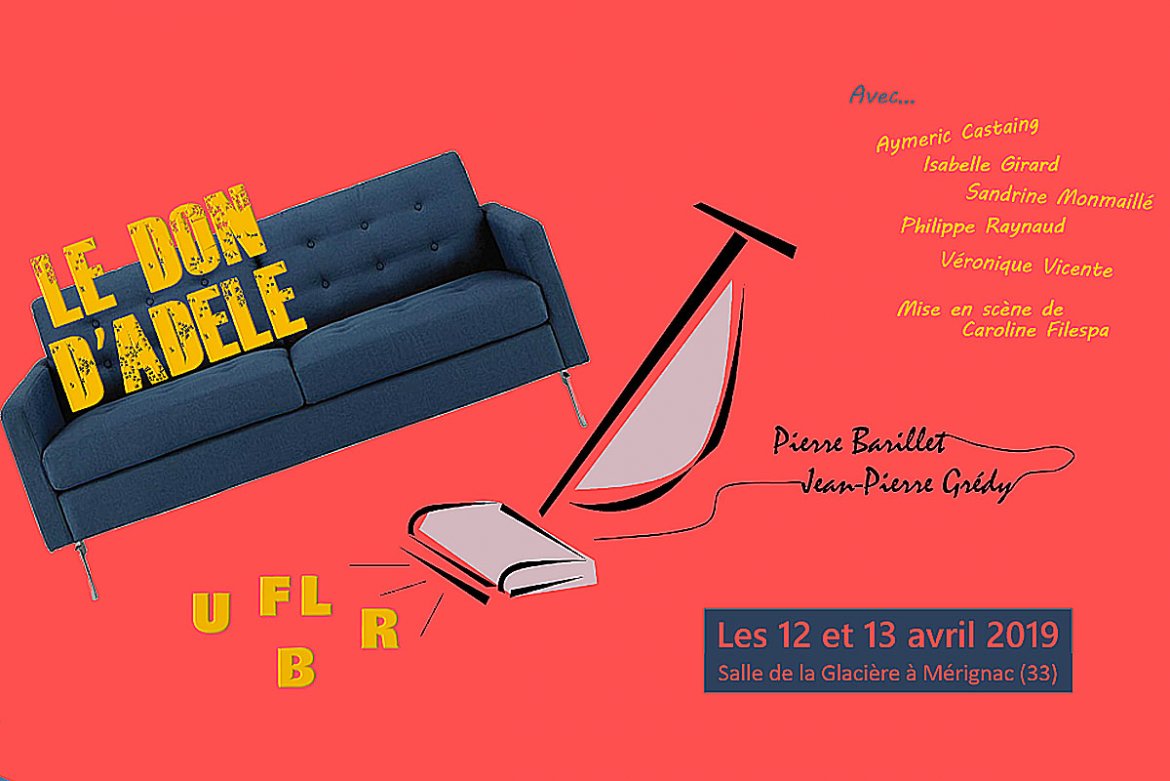 Le don d’Adèle est la toute première pièce écrite par Barillet et Grédy, célèbre duo d’auteurs à l’origine de la plupart des grands succès de la comédie de boulevard en France. Leurs textes ont été popularisés par l’émission Au théâtre ce soir et joués par les plus grands : Jacqueline Maillan, Maria Pacôme, Jacques Jouanneau… La pièce fut montée pour la première fois à Bordeaux en 1949, avant de conquérir la capitale pour plusieurs milliers de représentations. Satire de la société bourgeoise, Le don d’Adèle est une pièce moderne et indémodable, servie avec humour par la troupe de l’Uflrb avec Aymeric Castaing, Isabelle Girard, Sandrine Monmaillé, Philippe Raynaud, Véronique Vicente et mise en scène par Caroline Filespa.