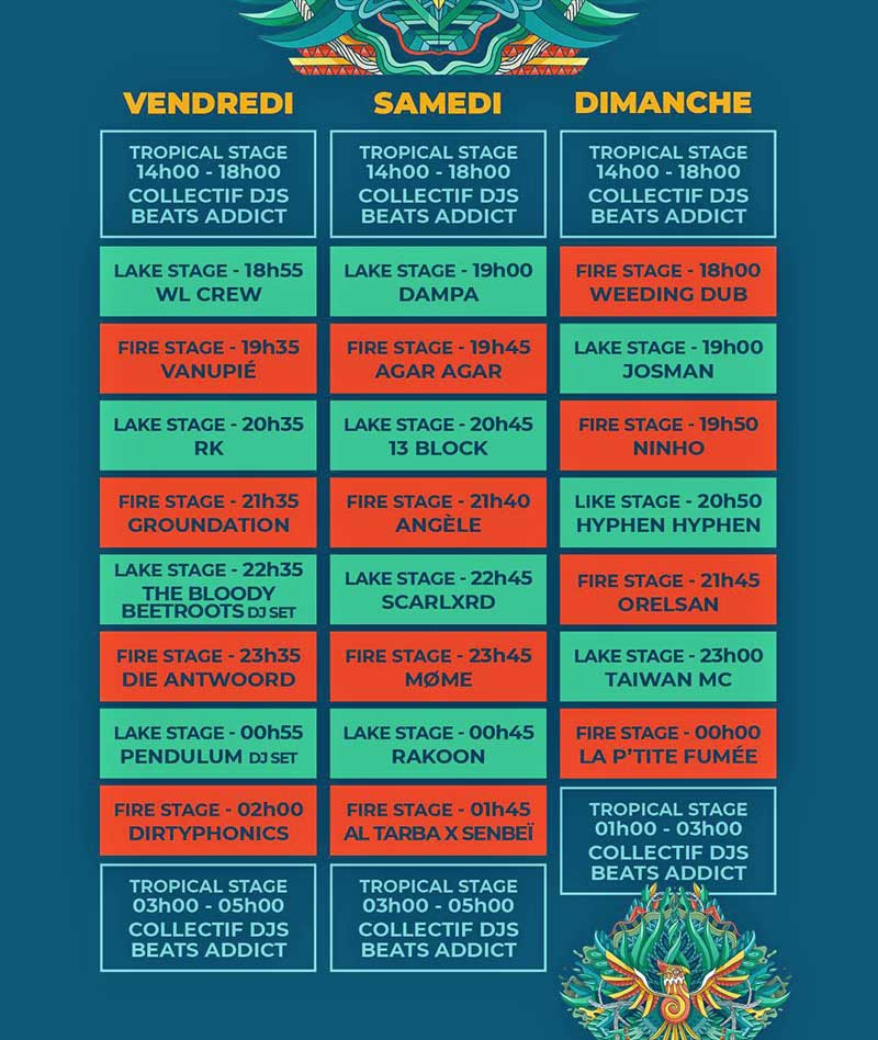 Cette année, c’est donc pas moins de 23 artistes qui fouleront les deux scènes (fire stage et lake stage). C’est ainsi que le vendredi nous retrouverons par exemple DIE ANTWOORD, DIRTYPHONICS, GROUNDATION, VANUPIE, le samedi ANGELE, AL’TARBA X SENBEÏ, AGAR AGAR, MØME, et enfin ORELSAN, NINHO, LA P’TITE FUMEE, HYPHEN HYPHEN le dimanche. Si le choix très éclectique de la programmation musicale ne fait aucun doute sur une nouvelle très belle affluence prévue, le festival met également en place le temple de jeux, avec des animations tous les jours jusqu’à 18h comme un tournoi de foot, un tournoi de pétanque, les combats de sumo, le ventriglisse, de la slickline, du tir à la corde, du waterline, et enfin du skate/longboard.